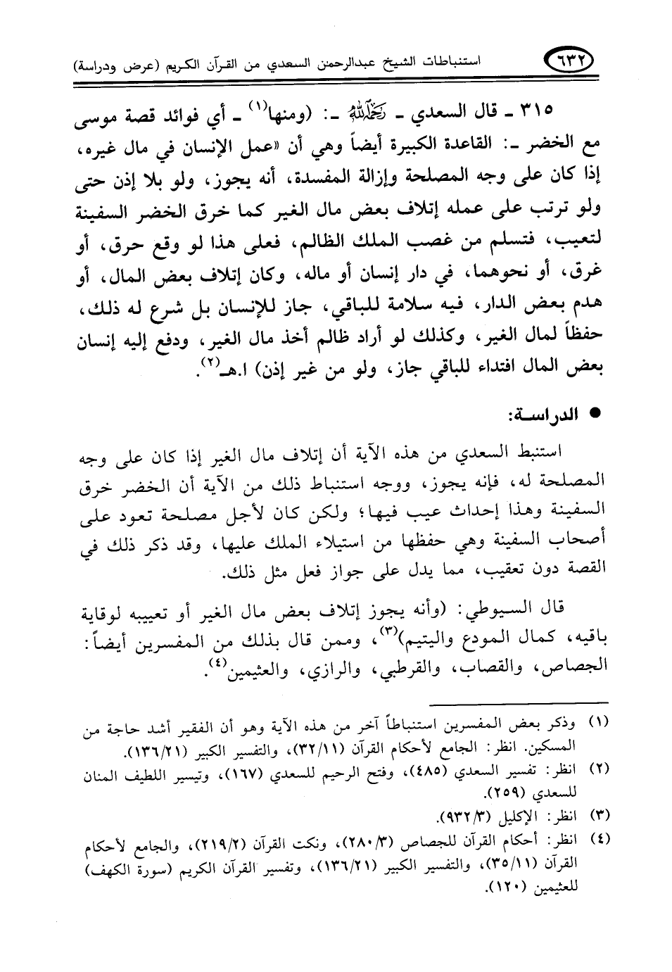قال السيوطي: (وأنه يجوز إتلاف بعض مال الغير أوتعييبه لوقاية باقيه، كمال المودع واليتيم) (¬٣)، وممن قال بذلك من المفسرين أيضاً: الجصاص، والقصاب، والقرطبي، والرازي، والعثيمين (¬٤).