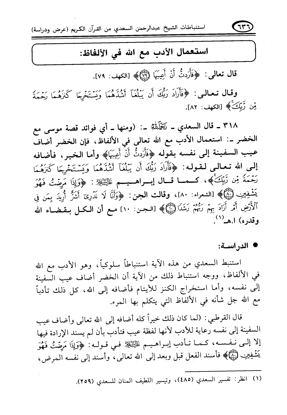 ٣١٨ - قال السعدي - رحمه الله -: (ومنها-أي فوائد قصة موسى مع الخضر-: استعمال الأدب مع الله تعالى في الألفاظ، فإن الخضر أضاف عيب السفينة إلى نفسه بقوله {فَأَرَدْتُ أَنْ أَعِيبَهَا} وأما الخير، فأضافه إلى الله تعالى لقوله: {فَأَرَادَ رَبَّكَ أَنْ يَبْلُغَا أَشُدَّهُمَا وَيَسْتَخْرِجَا كَنْزَهُمَا رَحْمَةً مِنْ رَبِّكَ} كما قال إبراهيم عليه السلام {وَإِذَا مَرِضْتُ فَهُوَ يَشْفِينِ (٨٠)} [الشعراء: ٨٠]، وقالت الجن: {وَأَنَّا لَا نَدْرِي أَشَرٌّ أُرِيدَ بِمَنْ فِي الْأَرْضِ أَمْ أَرَادَ بِهِمْ رَبُّهُمْ رَشَدًا (١٠)} [الجن: ١٠] مع أن الكل بقضاء الله وقدره).ا. هـ (¬١)