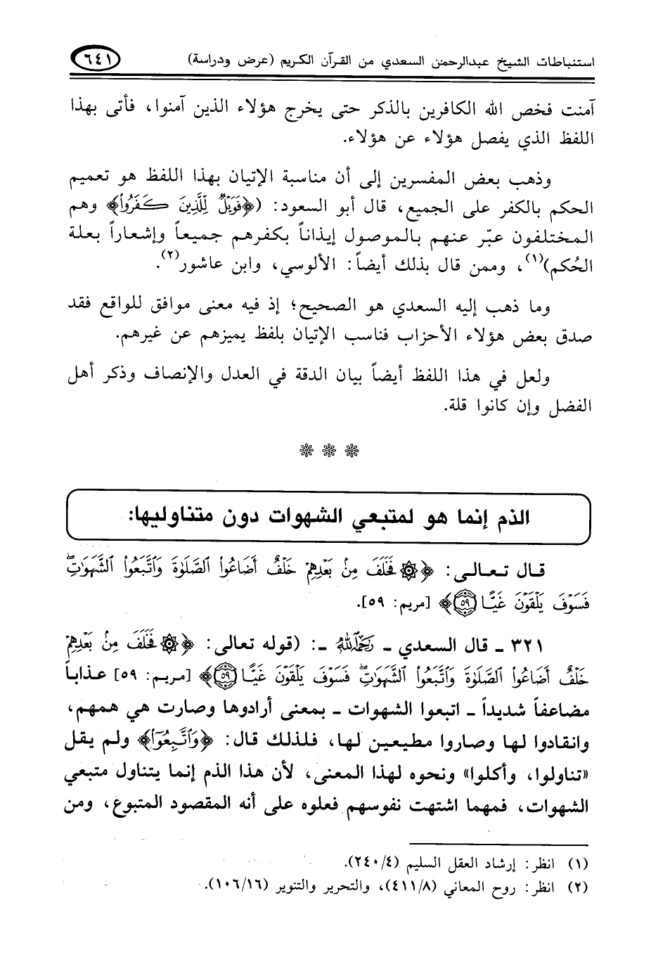 ٣٢١ - قال السعدي - رحمه الله -: (قوله تعالى: {فَخَلَفَ مِنْ بَعْدِهِمْ خَلْفٌ أَضَاعُوا الصَّلَاةَ وَاتَّبَعُوا الشَّهَوَاتِ فَسَوْفَ يَلْقَوْنَ غَيًّا (٥٩)} [مريم: ٥٩] عذاباً مضاعفاً شديداً - اتبعوا الشهوات بمعنى أرادوها وصارت هي همهم , وانقادوا لها وصاروا مطيعين لها , فلذلك قال: {وَاتَّبَعُوا} ولم يقل " تناولوا , وأكلوا " ونحوه لهذا المعنى , لأن هذا الذم إنما يتناول متبعي الشهوات , فمهما اشتهت نفوسهم فعلوه على أنه المقصود المتبوع، ومن