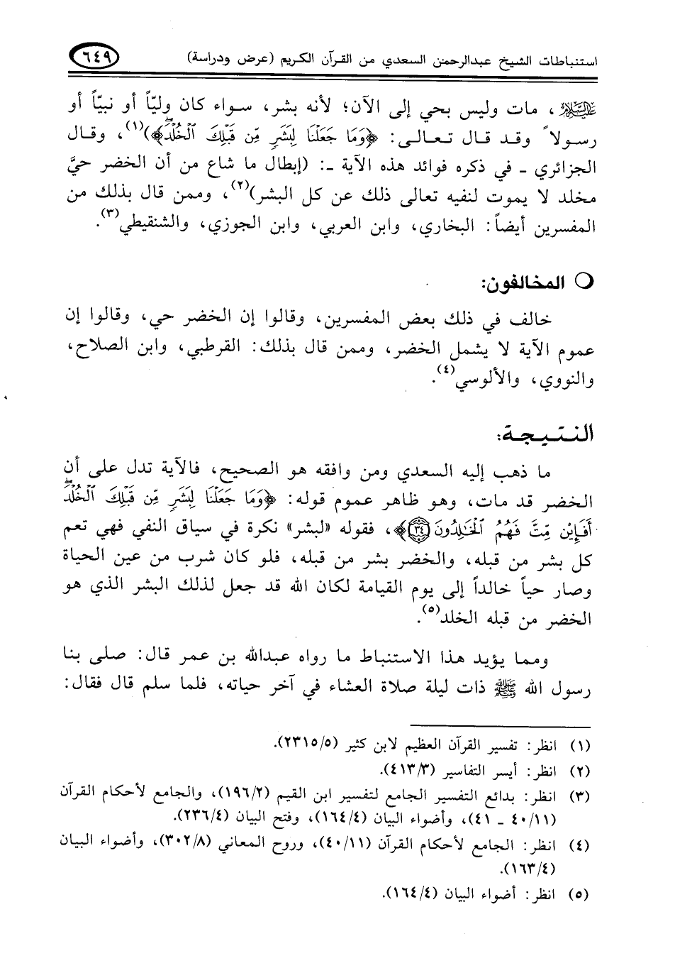 ما ذهب إليه السعدي ومن وافقه هو الصحيح، فالآية تدل على أن الخضر قد مات، وهو ظاهر عموم قوله: {وَمَا جَعَلْنَا لِبَشَرٍ مِنْ قَبْلَكَ الْخُلْدَ أَفَإِنْ مِتَّ فَهُمُ الْخَالِدُونَ (٣٤)}، فقوله " لبشر " نكرة في سياق النفي فهي تعم كل بشر من قبله، والخضر بشر من قبله، فلو كان شرب من عين الحياة وصار حياً خالداً إلى يوم القيامة لكان الله قد جعل لذلك البشر الذي هو الخضر من قبله الخلد (¬٥).