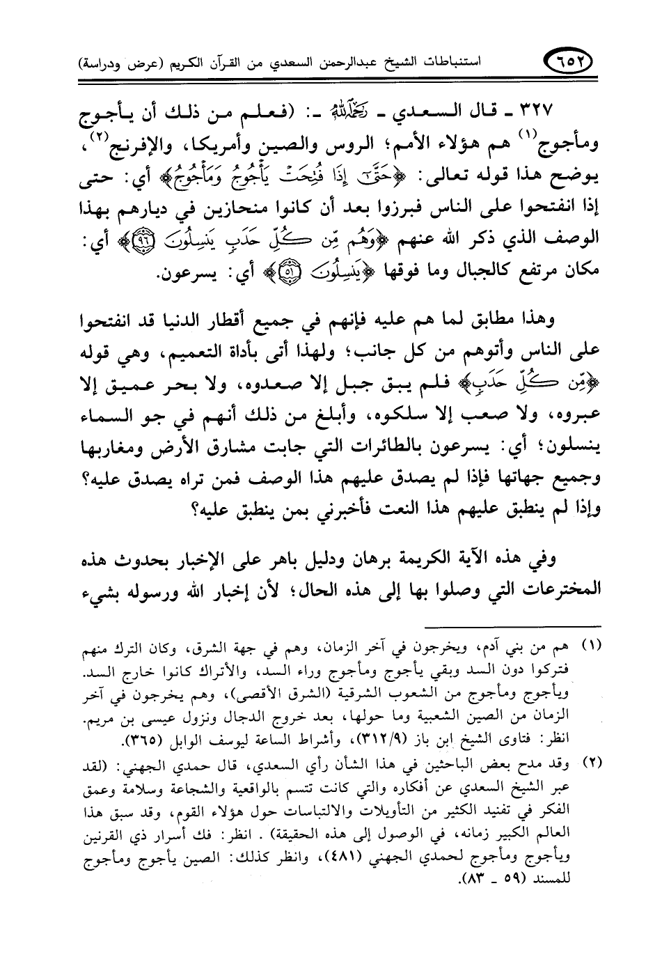 ٣٢٧ - قال السعدي - رحمه الله -: (فعلم من ذلك أن يأجوج ومأجوج (¬١) هم هؤلاء الأمم؛ الروس والصين وأمريكا، والإفرنج (¬٢)، يوضح هذا قوله تعالى: {حَتَّى إِذَا فُتِحَتْ يَأْجُوجُ وَمَأْجُوجُ} أي: حتى إذا انفتحوا على الناس فبرزوا بعد أن كانوا منحازين في ديارهم بهذا الوصف الذي ذكر الله عنهم {وَهُمْ مِنْ كُلِّ حَدَبٍ يَنْسِلُونَ (٩٦)} أي: مكان مرتفع كالجبال وما فوقها. {يَنْسِلُونَ} أي يسرعون.