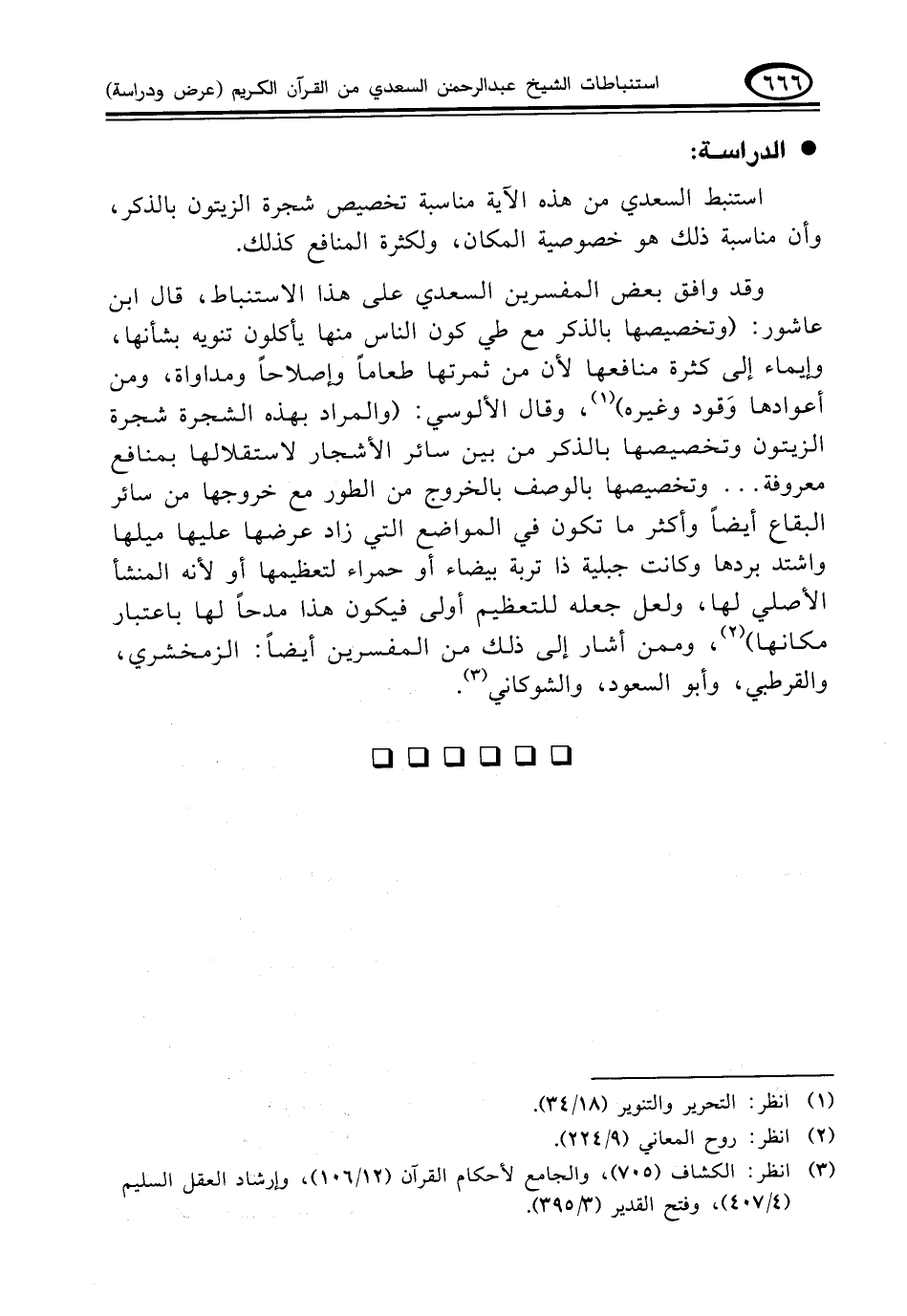 وقد وافق بعض المفسرين السعدي على هذا الاستنباط، قال ابن عاشور: (وتخصيصها بالذكر مع طي كون الناس منها يأكلون تنويه بشأنها، وإيماء إلى كثرة منافعها لأن من ثمرتها طعاماً وإصلاحاً ومداواة، ومن أعوادها وَقود وغيره) (¬١)، وقال الألوسي: (والمراد بهذه الشجرة شجرة الزيتون وتخصيصها بالذكر من بين سائر الأشجار لاستقلالها بمنافع معروفة. . . وتخصيصها بالوصف بالخروج من الطور مع خروجها من سائر البقاع أيضاً وأكثر ما تكون في المواضع التي زاد عرضها عليها ميلها واشتد بردها وكانت جبلية ذا تربة بيضاء أو حمراء لتعظيمها أو لأنه المنشأ الأصلي لها، ولعل جعله للتعظيم أولى فيكون هذا مدحاً لها باعتبار مكانها) (¬٢)، وممن أشار إلى ذلك من المفسرين أيضاً: الزمخشري، والقرطبي، وأبو السعود، والشوكاني (¬٣).