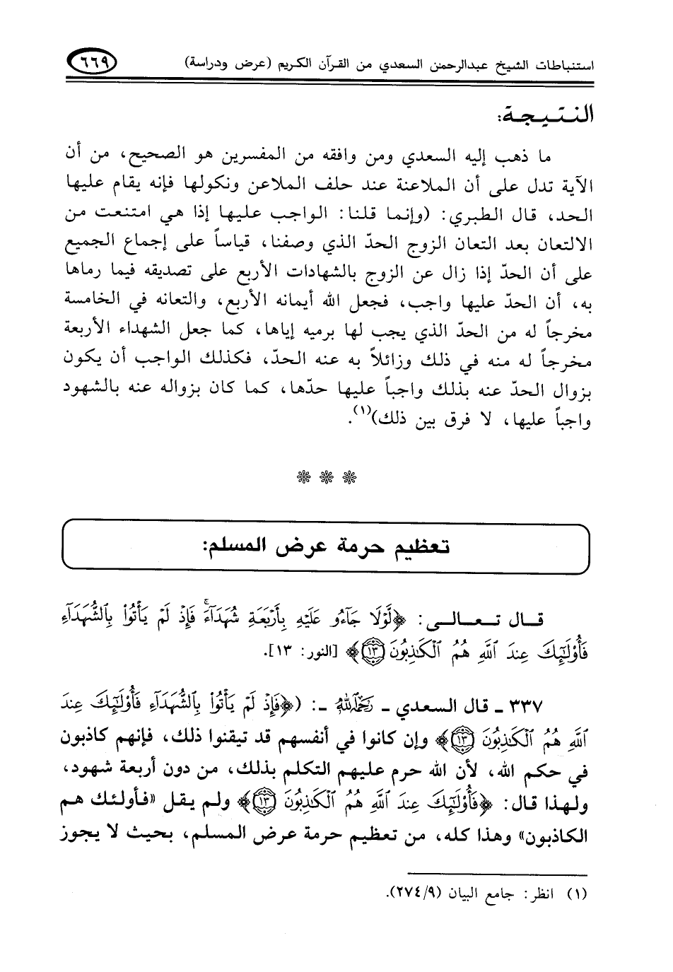 ٣٣٧ - قال السعدي - رحمه الله -: ({فَإِذْ لَمْ يَأْتُوا بِالشُّهَدَاءِ فَأُولَئِكَ عِنْدَ اللَّهِ هُمُ الْكَاذِبُونَ (١٣)} وإن كانوا في أنفسهم قد تيقنوا ذلك، فإنهم كاذبون في حكم الله، لأن الله حرم عليهم التكلم بذلك، من دون أربعة شهود، ولهذا قال: {فَأُولَئِكَ عِنْدَ اللَّهِ هُمُ الْكَاذِبُونَ (١٣)} ولم يقل " فأولئك هم الكاذبون " وهذا كله، من تعظيم حرمة عرض المسلم، بحيث لا يجوز
