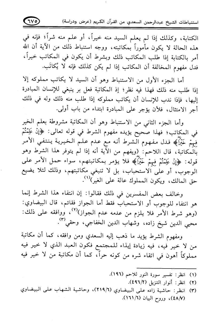ومفهوم الشرط يؤيد ما ذهب إليه السعدي ومن وافقه، كما أن مكاتبة من لا خير فيه، فيه زيادة إيذاء للمجتمع فكون العبد الذي لا خير فيه مملوكاً أهون في اتقاء شره من كونه حراً، كما أن مكاتبة من لا خير فيه
