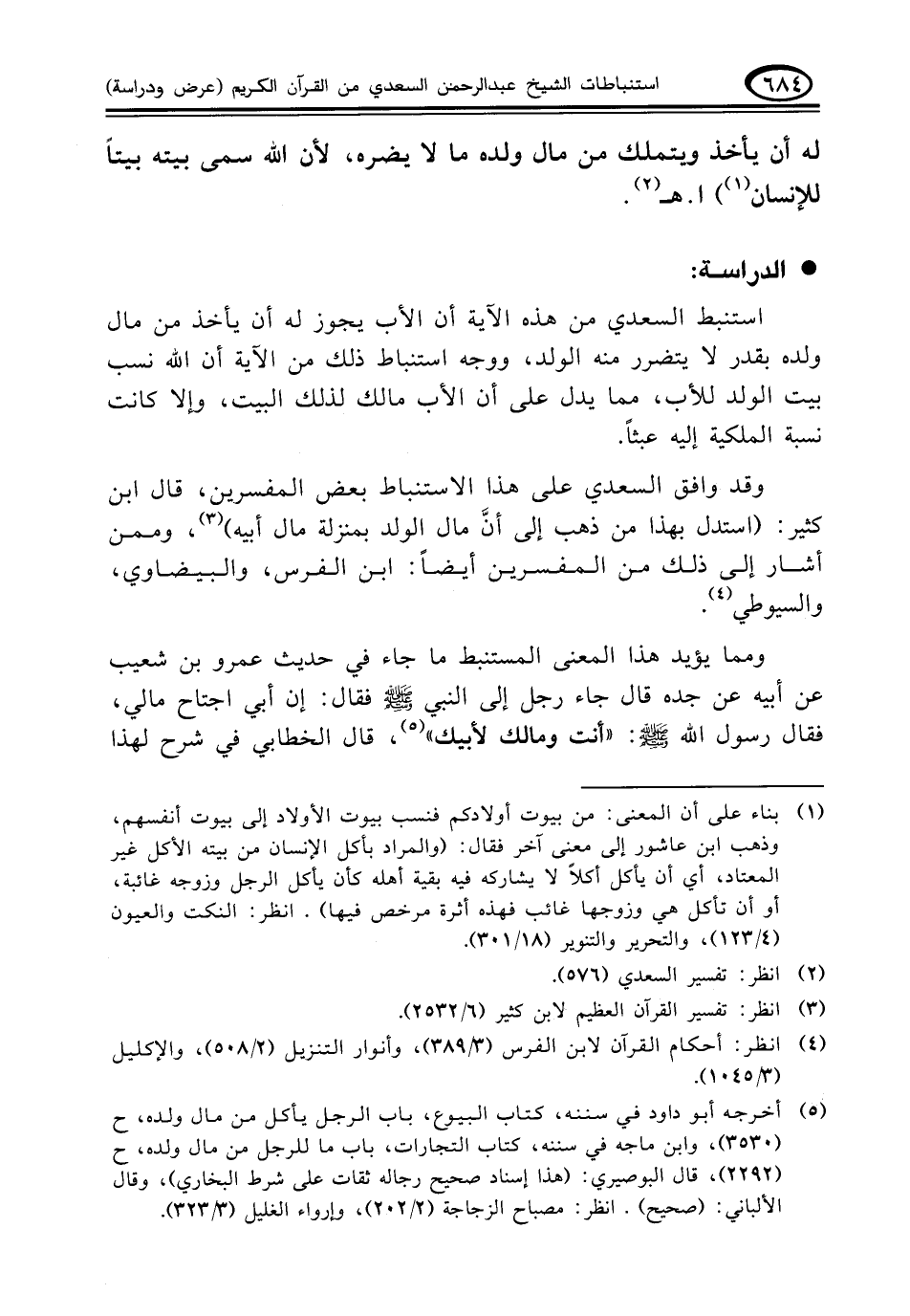 وقد وافق السعدي على هذا الاستنباط بعض المفسرين، قال ابن كثير: (استدل بهذا من ذهب إلى أنَّ مال الولد بمنزلة مال أبيه) (¬١)، وممن أشار إلى ذلك من المفسرين أيضاً: ابن الفرس، والبيضاوي، والسيوطي (¬٢).