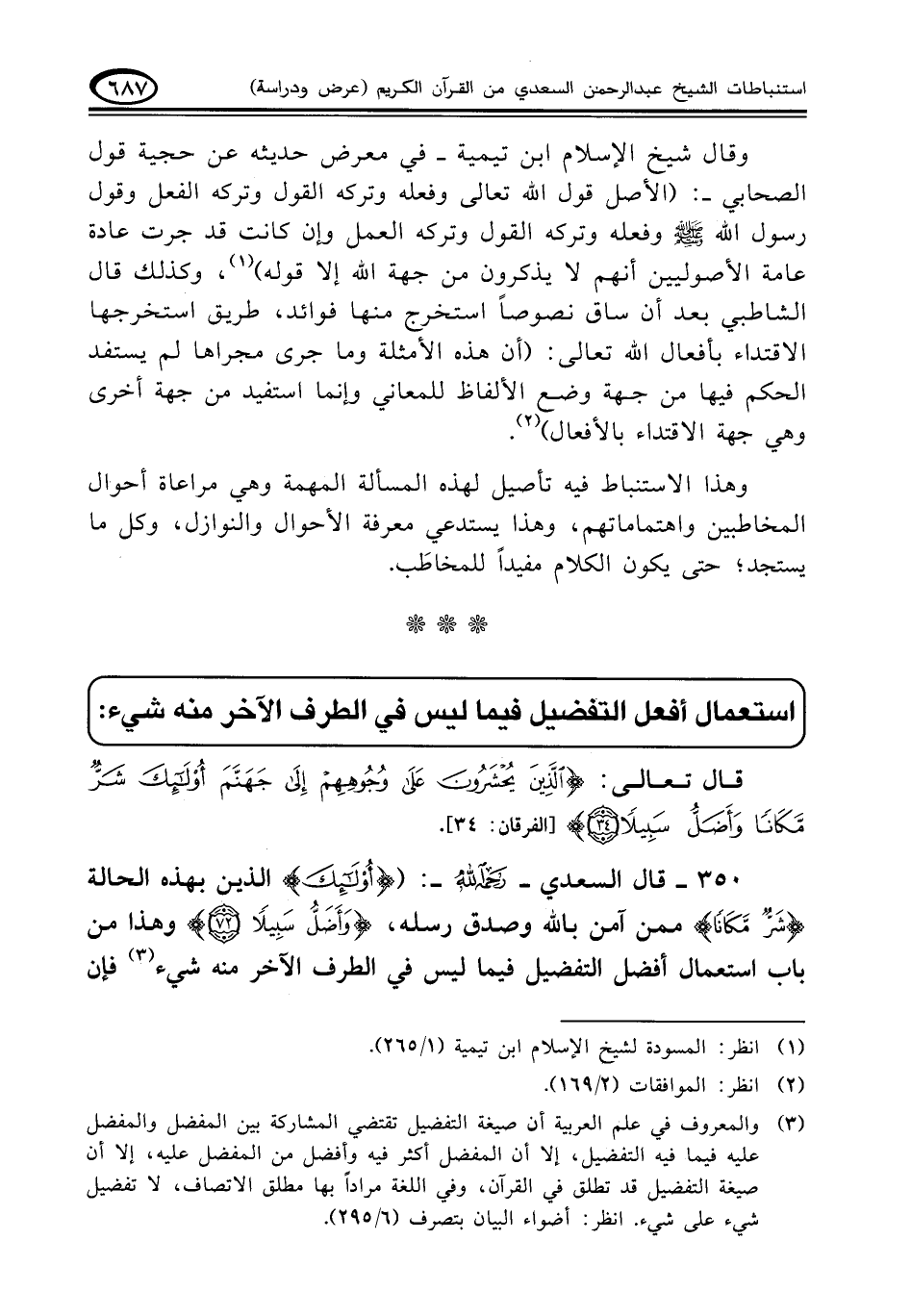 ٣٥٠ - قال السعدي - رحمه الله -: ({أُولَئِكَ} الذين بهذه الحالة {شَرٌّ مَكَانًا} ممن آمن بالله وصدق رسله، {وَأَضَلُّ سَبِيلًا} وهذا من باب استعمال أفضل التفضيل فيما ليس في الطرف الآخر منه شيء (¬٣) فإن