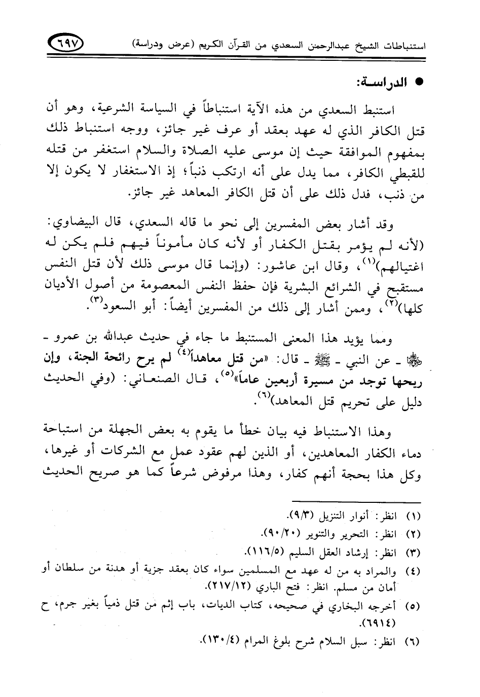 وقد أشار بعض المفسرين إلى نحو ما قاله السعدي، قال البيضاوي: (لأنه لم يؤمر بقتل الكفار أو لأنه كان مأموناً فيهم فلم يكن له اغتيالهم) (¬١)، وقال ابن عاشور: (وإنما قال موسى ذلك لأن قتل النفس مستقبح في الشرائع البشرية فإن حفظ النفس المعصومة من أصول الأديان كلها) (¬٢)، وممن أشار إلى ذلك من المفسرين أيضاً: أبوالسعود (¬٣).