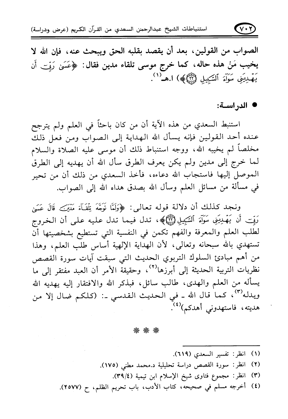 استنبط السعدي من هذه الآية أن من كان باحثاً في العلم ولم يترجح عنده أحد القولين فإنه يسأل الله الهداية إلى الصواب ومن فعل ذلك مخلصاً لم يخيبه الله، ووجه استنباط ذلك أن موسى عليه الصلاة والسلام لما خرج إلى مدين ولم يكن يعرف الطرق سأل الله أن يهديه إلى الطرق الموصل إليها فاستجاب الله دعاءه، فأخذ السعدي من ذلك أن من تحير في مسألة من مسائل العلم وسأل الله بصدق هداه الله إلى الصواب.