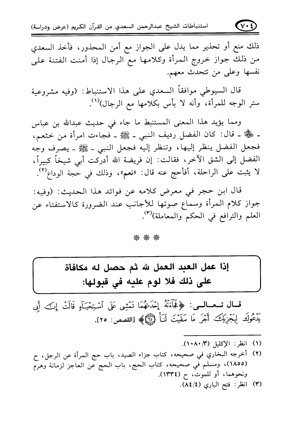 قال السيوطي موافقاً السعدي على هذا الاستنباط: (وفيه مشروعية ستر الوجه للمرأة، وأنه لا بأس بكلامها مع الرجال). (¬١)