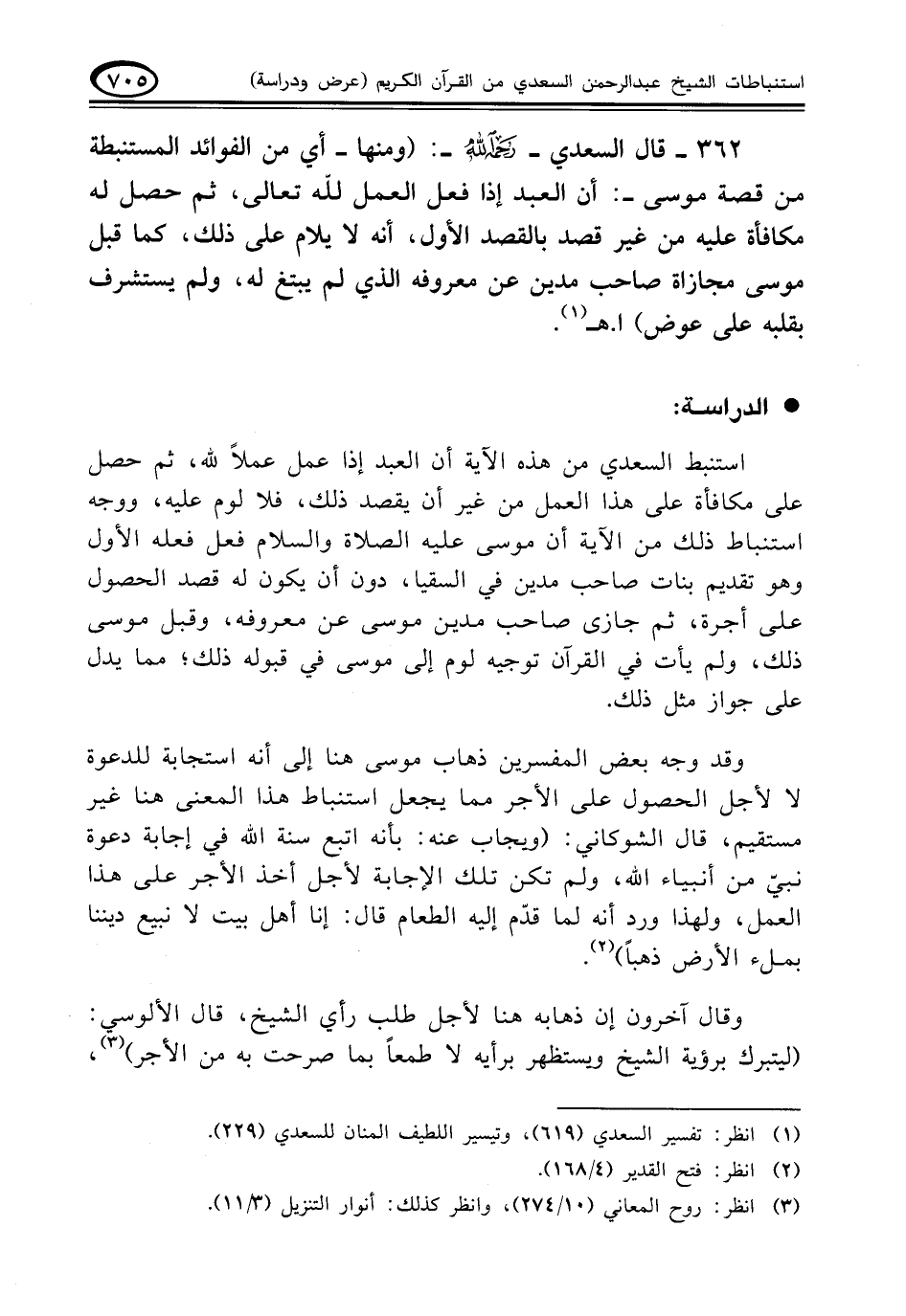 ٣٦٢ - قال السعدي - رحمه الله -: (ومنها-أي من الفوائد المستنبطة من قصة موسى-: أن العبد إذا فعل العمل لله تعالى، ثم حصل له مكافأة عليه من غير قصد بالقصد الأول، أنه لا يلام على ذلك، كما قبل موسى مجازاة صاحب مدين عن معروفه الذي لم يبتغ له، ولم يستشرف بقلبه على عوض).ا. هـ (¬١)