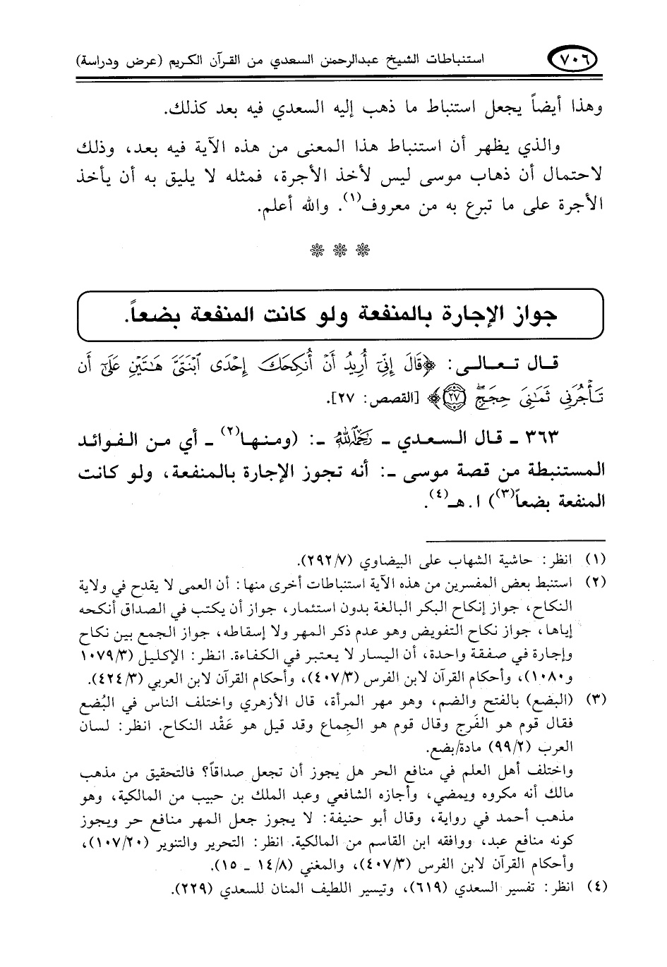 ٣٦٣ - قال السعدي - رحمه الله -: (ومنها (¬٢) -أي من الفوائد المستنبطة من قصة موسى -: أنه تجوز الإجارة بالمنفعة، ولو كانت المنفعة بضعاً (¬٣)).