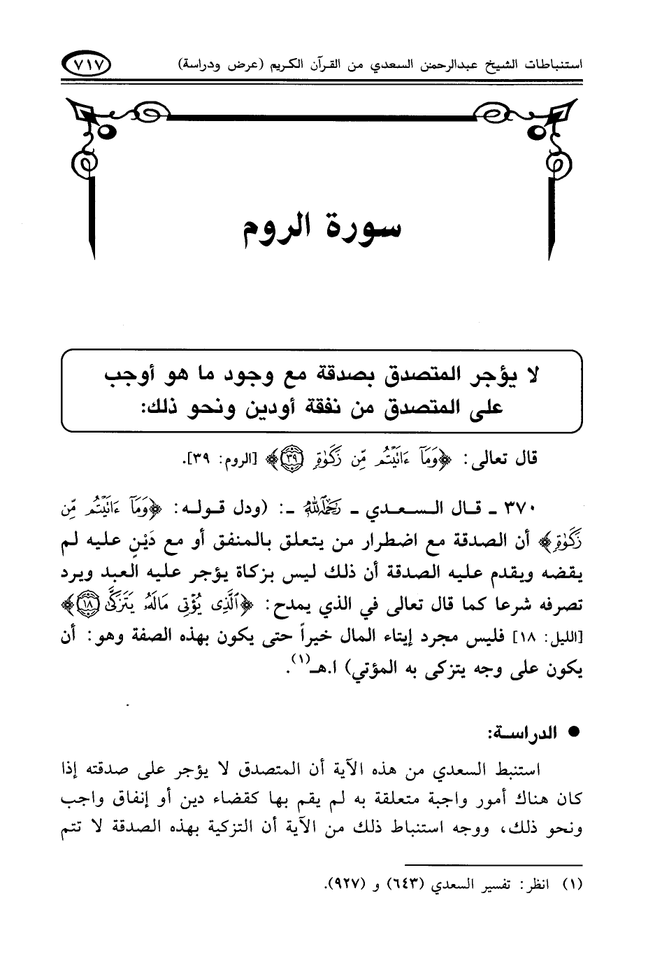 ٣٧٠ - قال السعدي - رحمه الله -: (ودل قوله: {وَمَا آَتَيْتُمْ مِنْ زَكَاةٍ} أن الصدقة مع اضطرار من يتعلق بالمنفق أو مع دَيْنٍ عليه لم يقضه ويقدم عليه الصدقة أن ذلك ليس بزكاة يؤجر عليه العبد ويرد تصرفه شرعا كما قال تعالى في الذي يمدح: {الَّذِي يُؤْتِي مَالَهُ يَتَزَكَّى (١٨)} [الليل: ١٨] فليس مجرد إيتاء المال خيراً حتى يكون بهذه الصفة وهو: أن يكون على وجه يتزكى به المؤتي). ا. هـ (¬١)