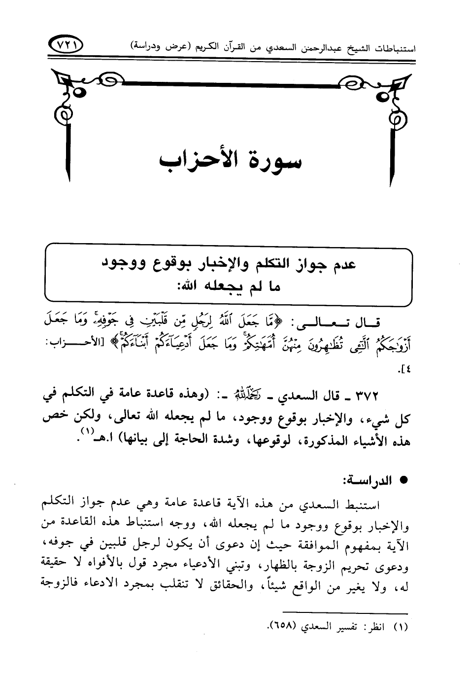 استنبط السعدي من هذه الآية قاعدة عامة وهي عدم جواز التكلم والإخبار بوقوع ووجود ما لم يجعله الله، ووجه استنباط هذه القاعدة من الآية بمفهوم الموافقة حيث إن دعوى أن يكون لرجل قلبين في جوفه، ودعوى تحريم الزوجة بالظهار، وتبني الأدعياء مجرد قول بالأفواه لا حقيقة له، ولا يغير من الواقع شيئاً، والحقائق لا تنقلب بمجرد الادعاء فالزوجة