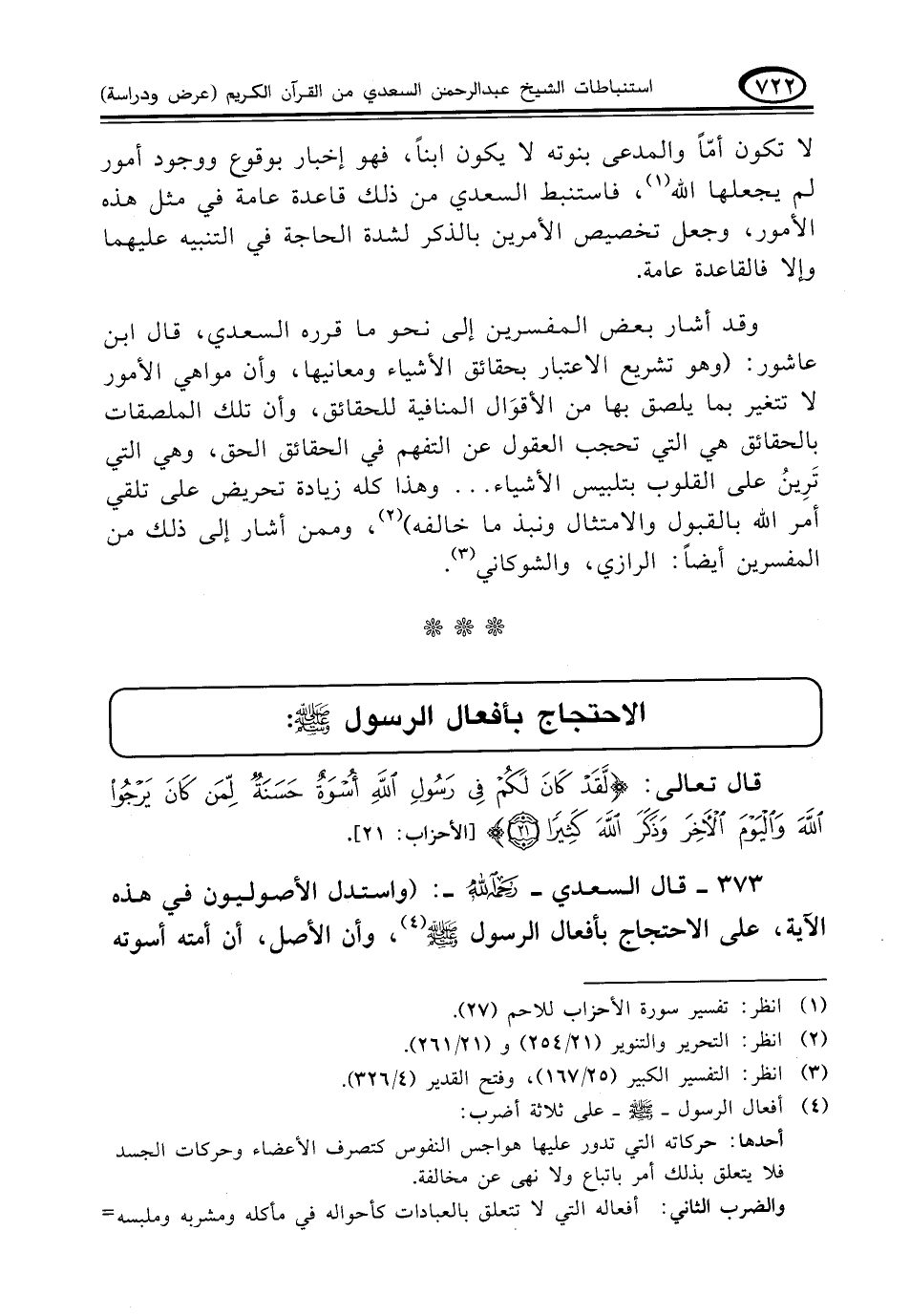 ٣٧٣ - قال السعدي - رحمه الله -: (واستدل الأصوليون في هذه الآية، على الاحتجاج بأفعال الرسول صلى الله عليه وسلم (¬٤)،