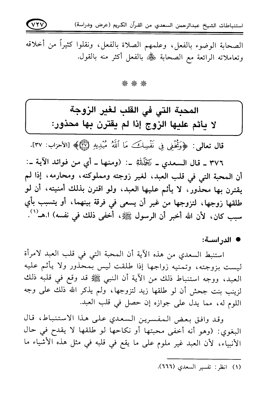 ٣٧٦ - قال السعدي - رحمه الله -: (ومنها-أي من فوائد الآية-: أن المحبة التي في قلب العبد، لغير زوجته ومملوكته، ومحارمه، إذا لم يقترن بها محذور، لا يأثم عليها العبد، ولو اقترن بذلك أمنيته، أن لو طلقها زوجها، لتزوجها من غير أن يسعى في فرقة بينهما، أو يتسبب بأي سبب كان، لأن الله أخبر أن الرسول صلى الله عليه وسلم، أخفى ذلك في نفسه).ا. هـ (¬١)