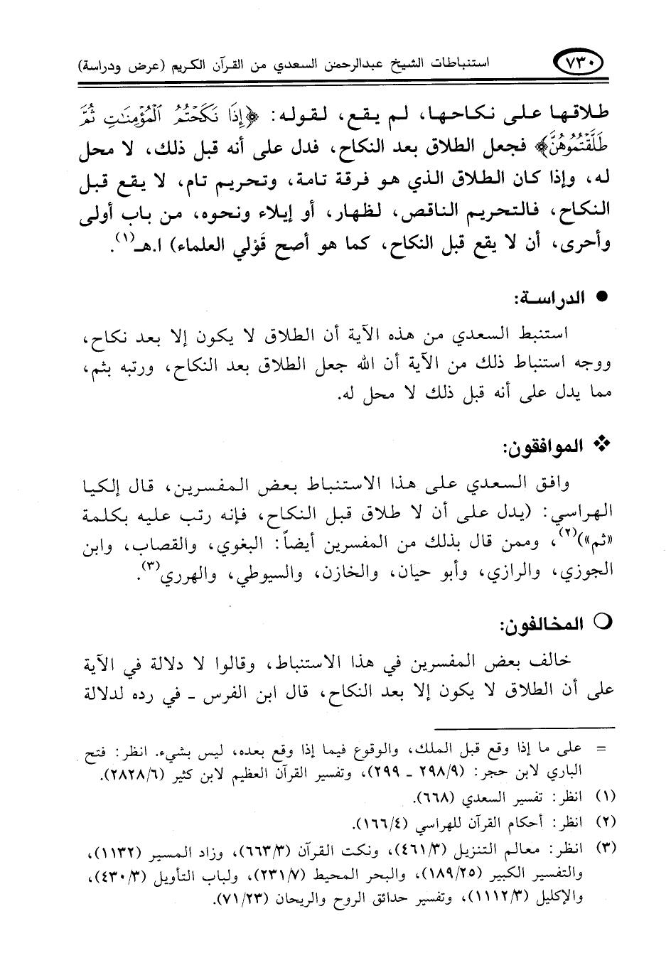 وافق السعدي على هذا الاستنباط بعض المفسرين، قال إلكيا الهراسي: (يدل على أن لا طلاق قبل النكاح، فإنه رتب عليه بكلمة"ثم") (¬٢)، وممن قال بذلك من المفسرين أيضاً: البغوي، والقصاب، وابن الجوزي، والرازي، وأبوحيان، والخازن، والسيوطي، والهرري (¬٣).