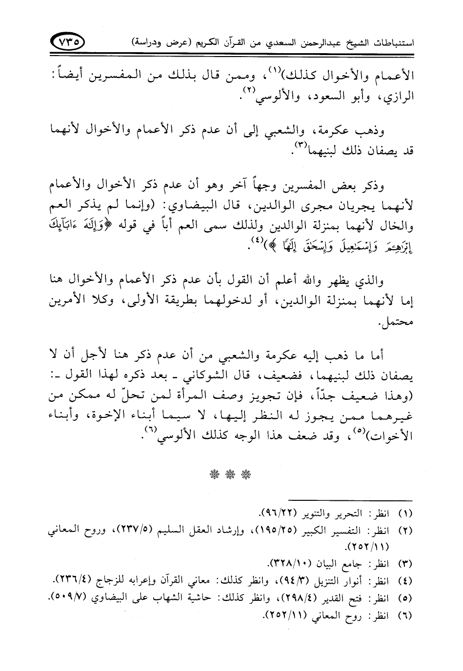 وذكر بعض المفسرين وجهاً آخر وهو أن عدم ذكر الأخوال والأعمام لأنهما يجريان مجرى الوالدين، قال البيضاوي: (وإنما لم يذكر العم والخال لأنهما بمنزلة الوالدين ولذلك سمى العم أبا في قوله {وَإِلَهَ آبَائِكَ إِبْرَاهِيمَ وَإِسْمَاعِيلَ وَإِسْحَاقَ إِلَهًا}) (¬٤).