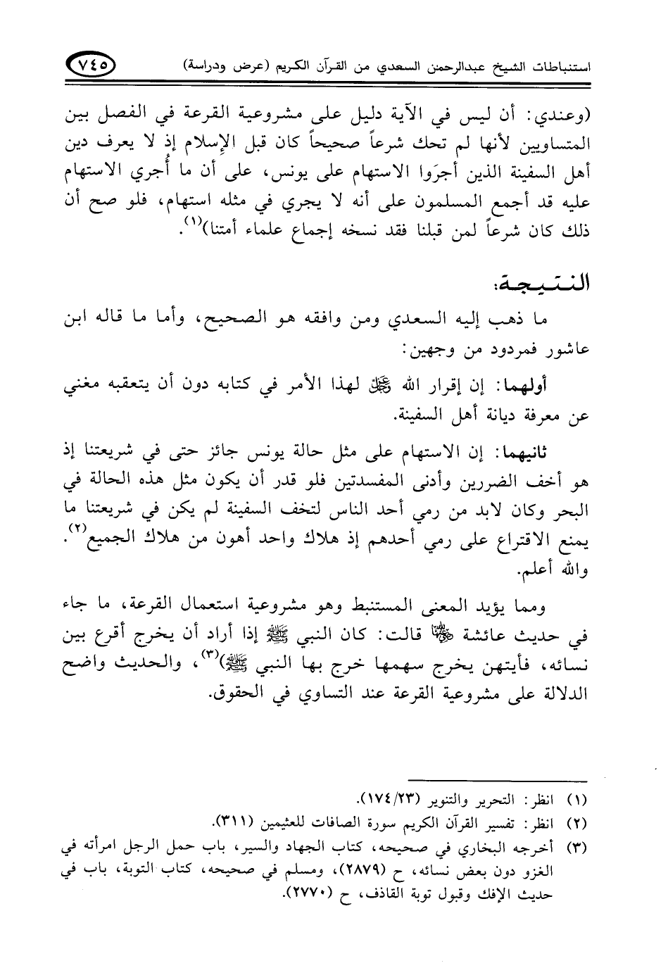 (وعندي: أن ليس في الآية دليل على مشروعية القرعة في الفصل بين المتساويين لأنها لم تحك شرعاً صحيحاً كان قبل الإِسلام إذ لا يعرف دين أهل السفينة الذين أجرَوْا الاستهام على يونس، على أن ما أُجري الاستهام عليه قد أجمع المسلمون على أنه لا يجري في مثله استهام، فلو صح أن ذلك كان شرعاً لمن قبلنا فقد نسخه إجماع علماء أمتنا) (¬١).
