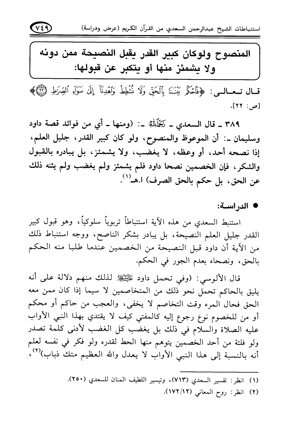 ٣٨٩ - قال السعدي - رحمه الله -: (ومنها-أي من فوائد قصة داود وسليمان-: أن الموعوظ والمنصوح، ولو كان كبير القدر، جليل العلم، إذا نصحه أحد، أو وعظه، لا يغضب، ولا يشمئز، بل يبادره بالقبول والشكر، فإن الخصمين نصحا داود فلم يشمئز ولم يغضب ولم يثنه ذلك عن الحق، بل حكم بالحق الصرف) ا. هـ (¬١)
