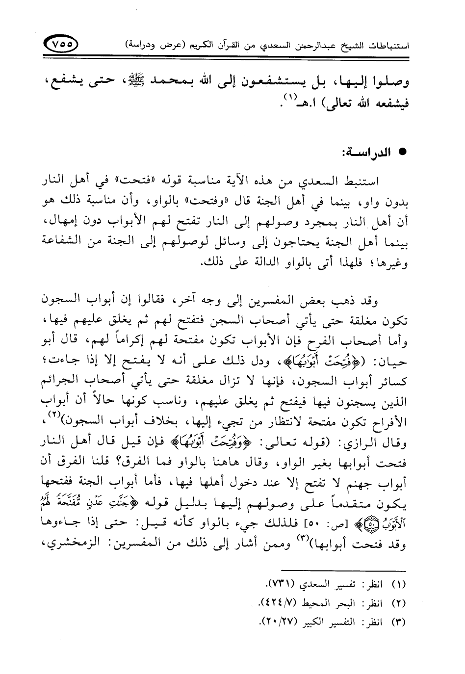 استنبط السعدي من هذه الآية مناسبة قوله "فتحت" في أهل النار بدون واو، بينما في أهل الجنة قال "وفتحت"بالواو، وأن مناسبة ذلك هو أن أهل النار بمجرد وصولهم إلى النار تفتح لهم الأبواب دون إمهال، بينما أهل الجنة يحتاجون إلى وسائل لوصولهم إلى الجنة من الشفاعة وغيرها؛ فلهذا أتى بالواو الدالة على ذلك.