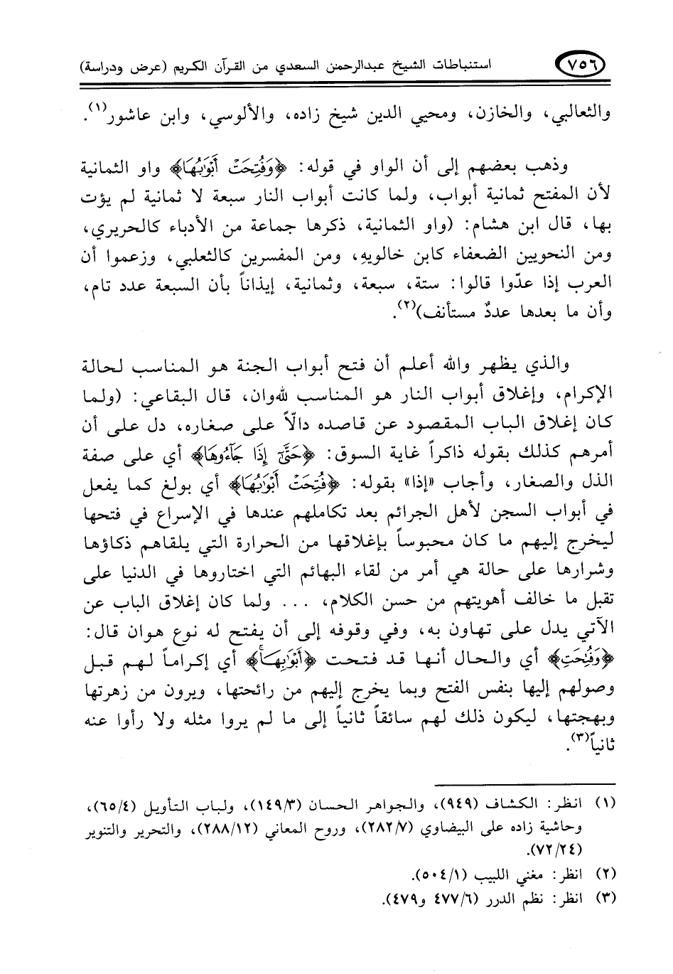 وذهب بعضهم إلى أن الواو في قوله: {وَفُتِحَتْ أَبْوَابُهَا} واو الثمانية لأن المفتح ثمانية أبواب، ولما كانت أبواب النار سبعة لا ثمانية لم يؤت بها، قال ابن هشام: (واو الثمانية، ذكرها جماعة من الأدباء كالحريري، ومن النحويين الضعفاء كابن خالويهِ، ومن المفسرين كالثعلبي، وزعموا أن العرب إذا عدّوا قالوا: ستة، سبعة، وثمانية، إيذاناً بأن السبعة عدد تام، وأن ما بعدها عددٌ مستأنف) (¬٢).