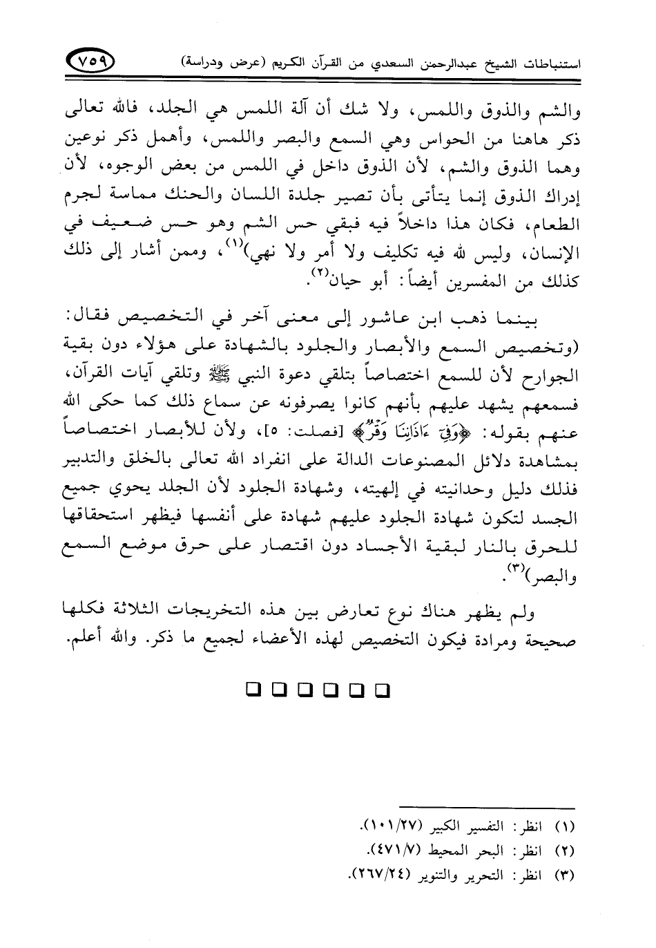 بينما ذهب ابن عاشور إلى معنى آخر في التخصيص فقال: (وتخصيص السمع والأبصار والجلود بالشهادة على هؤلاء دون بقية الجوارح لأن للسمع اختصاصاً بتلقي دعوة النبي صلى الله عليه وسلم وتلقي آيات القرآن، فسمعهم يشهد عليهم بأنهم كانوا يصرفونه عن سماع ذلك كما حكى الله عنهم بقوله: {وَفِي آَذَانِنَا وَقْرٌ} [فصلت: ٥]، ولأن للأبصار اختصاصاً بمشاهدة دلائل المصنوعات الدالة على انفراد الله تعالى بالخلق والتدبير فذلك دليل وحدانيته في إلهيته، وشهادة الجلود لأن الجلد يحوي جميع الجسد لتكون شهادة الجلود عليهم شهادة على أنفسها فيظهر استحقاقها للحرق بالنار لبقية الأجساد دون اقتصار على حرق موضع السمع والبصر) (¬٣).