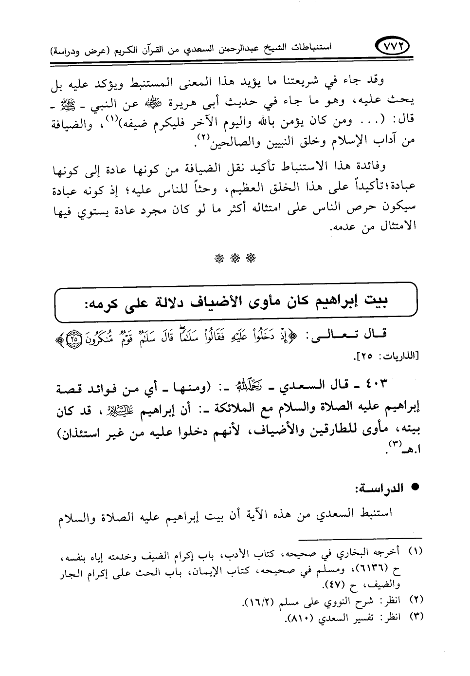 ٤٠٣ - قال السعدي - رحمه الله -: (ومنها-أي من فوائد قصة إبراهيم عليه الصلاة والسلام مع الملائكة-: أن إبراهيم عليه السلام، قد كان بيته، مأوى للطارقين والأضياف، لأنهم دخلوا عليه من غير استئذان). ا. هـ (¬٣)