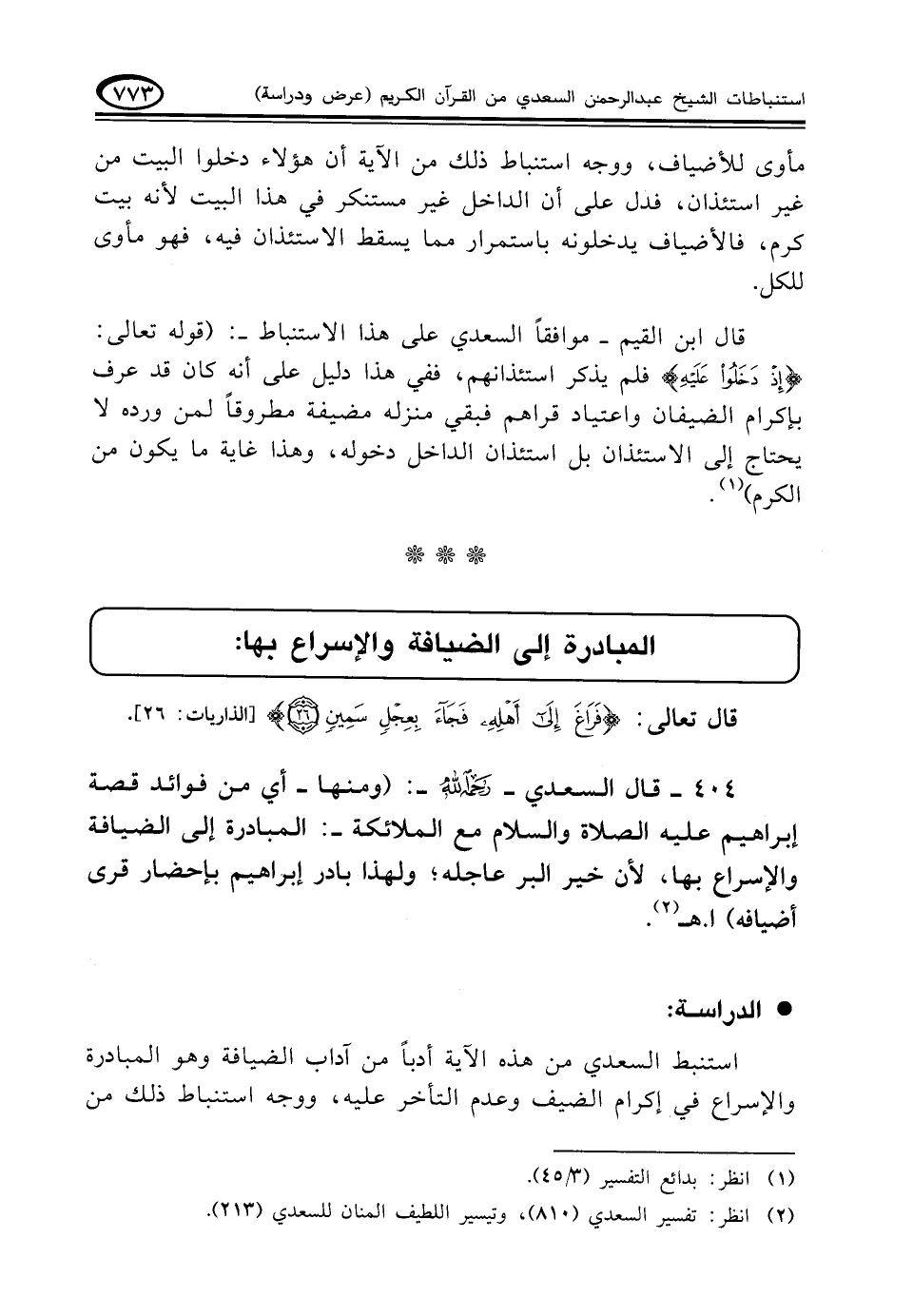 ٤٠٤ - قال السعدي - رحمه الله -: (ومنها-أي من فوائد قصة إبراهيم عليه الصلاة والسلام مع الملائكة-: المبادرة إلى الضيافة والإسراع بها، لأن خير البر عاجله؛ ولهذا بادر إبراهيم بإحضار قرى أضيافه). ا. هـ (¬٢)