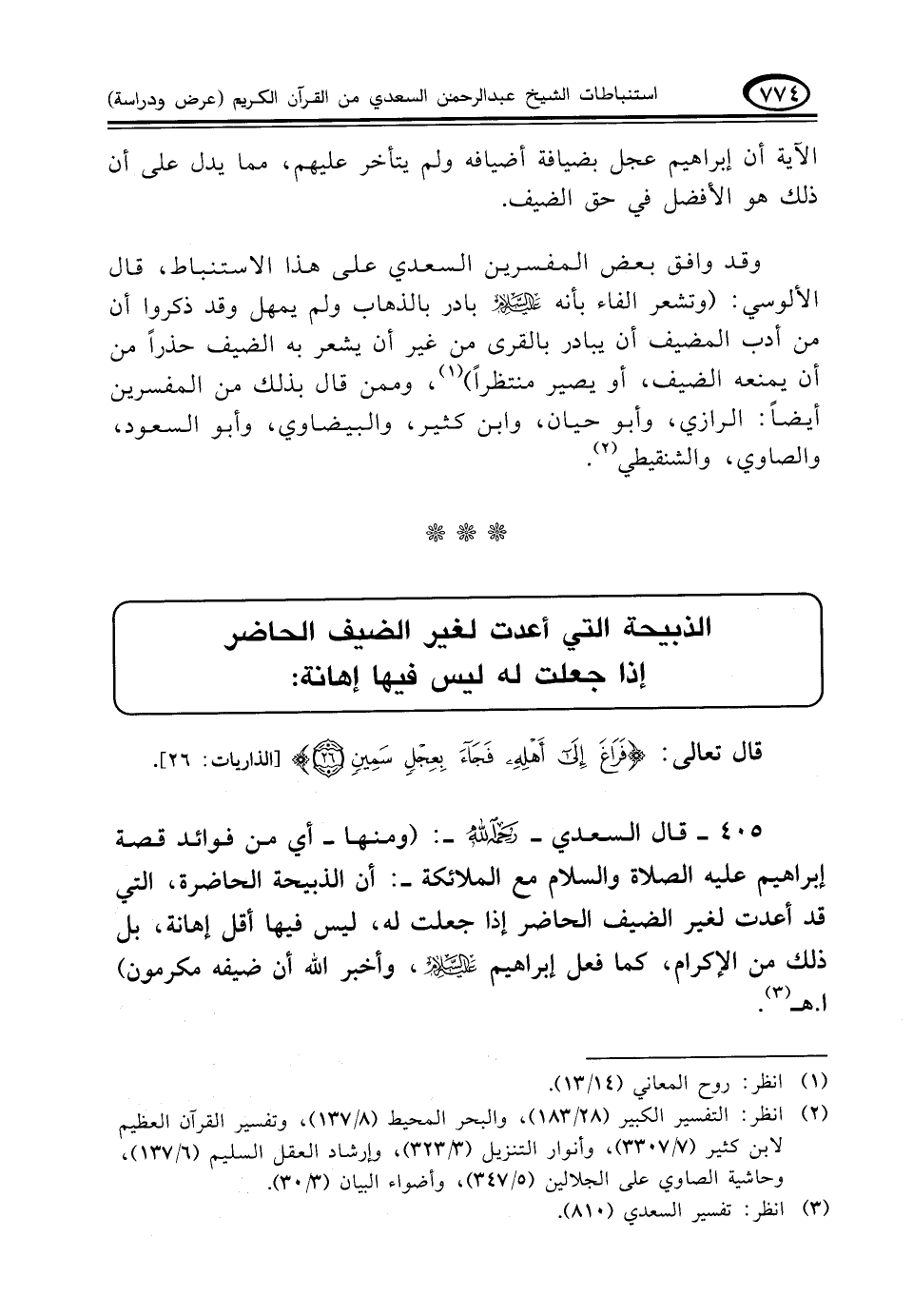 ٤٠٥ - قال السعدي - رحمه الله -: (ومنها-أي من فوائد قصة إبراهيم عليه الصلاة والسلام مع الملائكة-: أن الذبيحة الحاضرة، التي قد أعدت لغير الضيف الحاضر إذا جعلت له، ليس فيها أقل إهانة، بل ذلك من الإكرام، كما فعل إبراهيم عليه السلام، وأخبر الله أن ضيفه مكرمون). ا. هـ (¬٣)