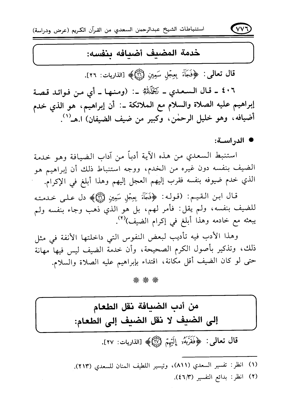٤٠٦ - قال السعدي - رحمه الله -: (ومنها-أي من فوائد قصة إبراهيم عليه الصلاة والسلام مع الملائكة-: أن إبراهيم، هو الذي خدم أضيافه، وهو خليل الرحمن، وكبير من ضيف الضيفان). ا. هـ (¬١)