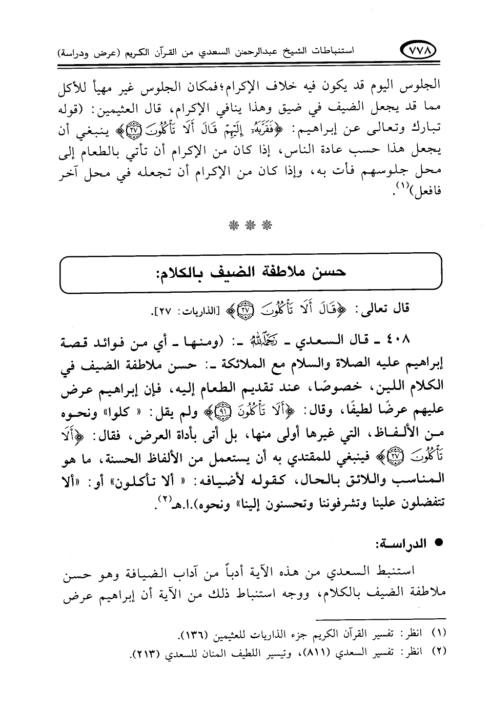 ٤٠٨ - قال السعدي - رحمه الله -: (ومنها-أي من فوائد قصة إبراهيم عليه الصلاة والسلام مع الملائكة-: حسن ملاطفة الضيف في الكلام اللين، خصوصًا، عند تقديم الطعام إليه، فإن إبراهيم عرض عليهم عرضًا لطيفًا، وقال: {أَلَا تَأْكُلُونَ} ولم يقل: " كلوا " ونحوه من الألفاظ، التي غيرها أولى منها، بل أتى بأداة العرض، فقال: {أَلَا تَأْكُلُونَ} فينبغي للمقتدي به أن يستعمل من الألفاظ الحسنة، ما هو المناسب واللائق بالحال، كقوله لأضيافه: " ألا تأكلون " أو: "ألا تتفضلون علينا وتشرفوننا وتحسنون إلينا " ونحوه). ا. هـ (¬٢)