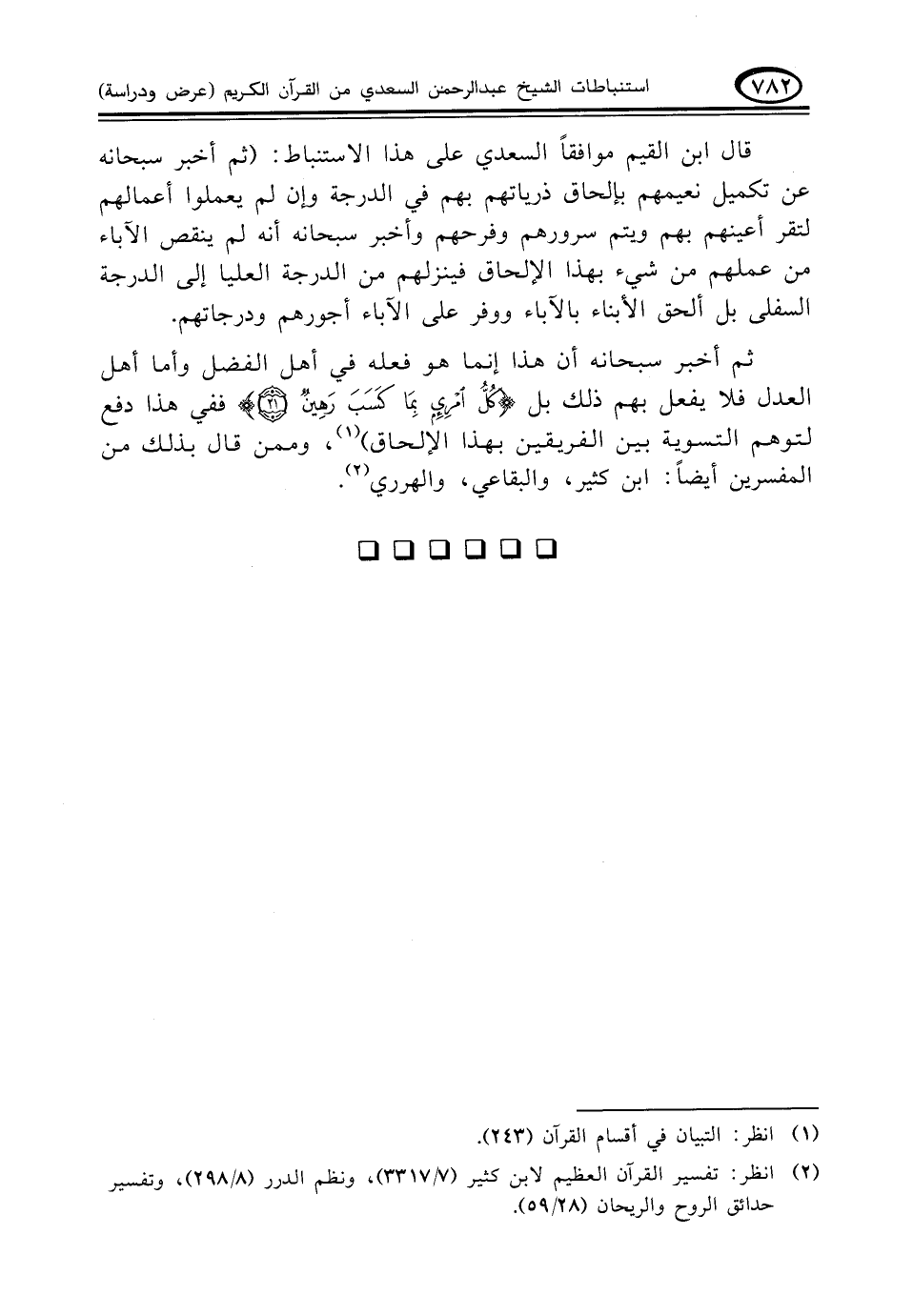قال ابن القيم موافقاً السعدي على هذا الاستنباط: (ثم أخبر سبحانه عن تكميل نعيمهم بإلحاق ذرياتهم بهم في الدرجة وإن لم يعملوا أعمالهم لتقر أعينهم بهم ويتم سرورهم وفرحهم وأخبر سبحانه أنه لم ينقص الآباء من عملهم من شيء بهذا الإلحاق فينزلهم من الدرجة العليا إلى الدرجة السفلى بل ألحق الأبناء بالآباء ووفر على الآباء أجورهم ودرجاتهم.