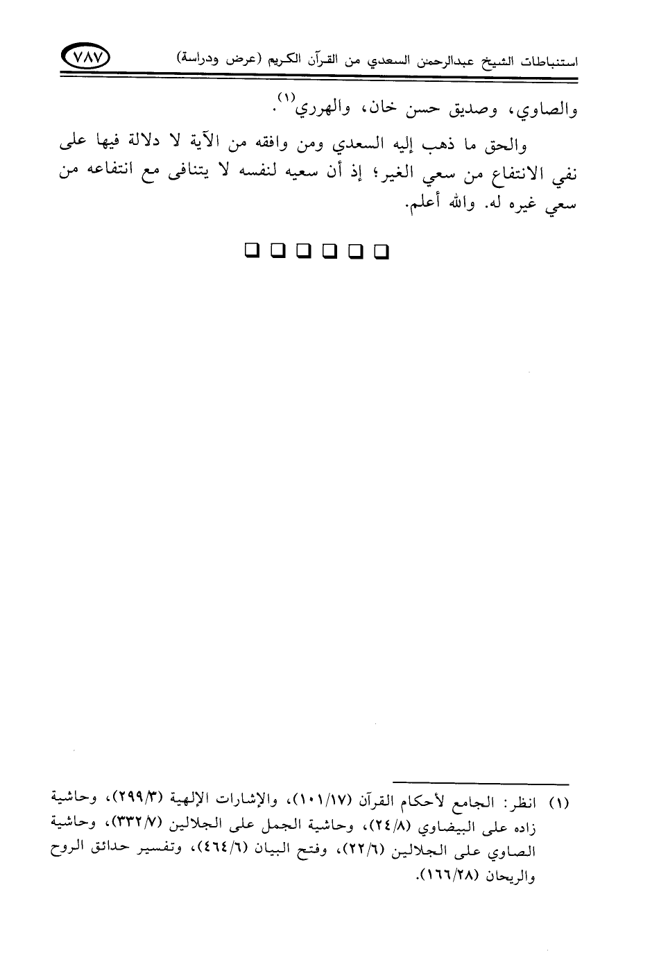 والحق ما ذهب إليه السعدي ومن وافقه من الآية لا دلالة فيها على نفي الانتفاع من سعي الغير؛ إذ أن سعيه لنفسه لا يتنافى مع انتفاعه من سعي غيره له. والله أعلم.