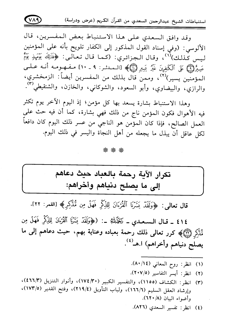 ٤١٤ - قال السعدي - رحمه الله -: ({وَلَقَدْ يَسَّرْنَا الْقُرْآَنَ لِلذِّكْرِ فَهَلْ مِنْ مُدَّكِرٍ} كرر تعالى ذلك رحمة بعباده وعناية بهم، حيث دعاهم إلى ما يصلح دنياهم وأخراهم). ا. هـ (¬٤)