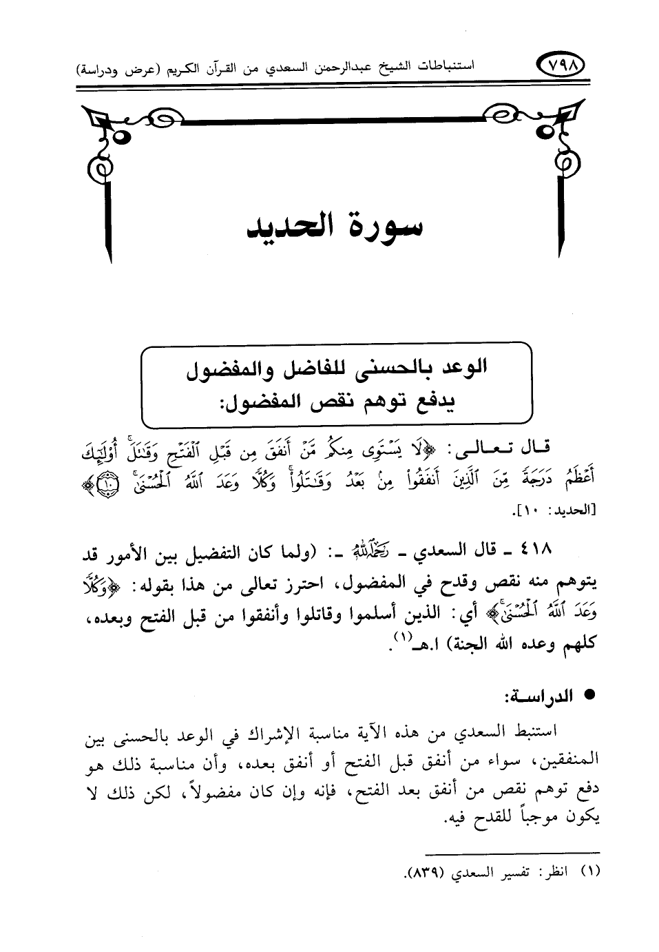 ٤١٨ - قال السعدي - رحمه الله -: (ولما كان التفضيل بين الأمور قد يتوهم منه نقص وقدح في المفضول، احترز تعالى من هذا بقوله: {وَكُلًّا وَعَدَ اللَّهُ الْحُسْنَى} أي: الذين أسلموا وقاتلوا وأنفقوا من قبل الفتح وبعده، كلهم وعده الله الجنة). ا. هـ (¬١)