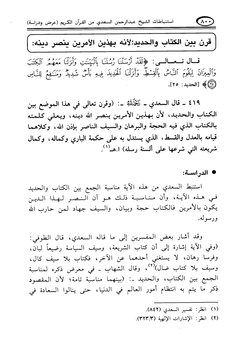 ٤١٩ - قال السعدي - رحمه الله -: (وقرن تعالى في هذا الموضع بين الكتاب والحديد، لأن بهذين الأمرين ينصر الله دينه، ويعلي كلمته بالكتاب الذي فيه الحجة والبرهان والسيف الناصر بإذن الله، وكلاهما قيامه بالعدل والقسط، الذي يستدل به على حكمة الباري وكماله، وكمال شريعته التي شرعها على ألسنة رسله). ا. هـ (¬١)