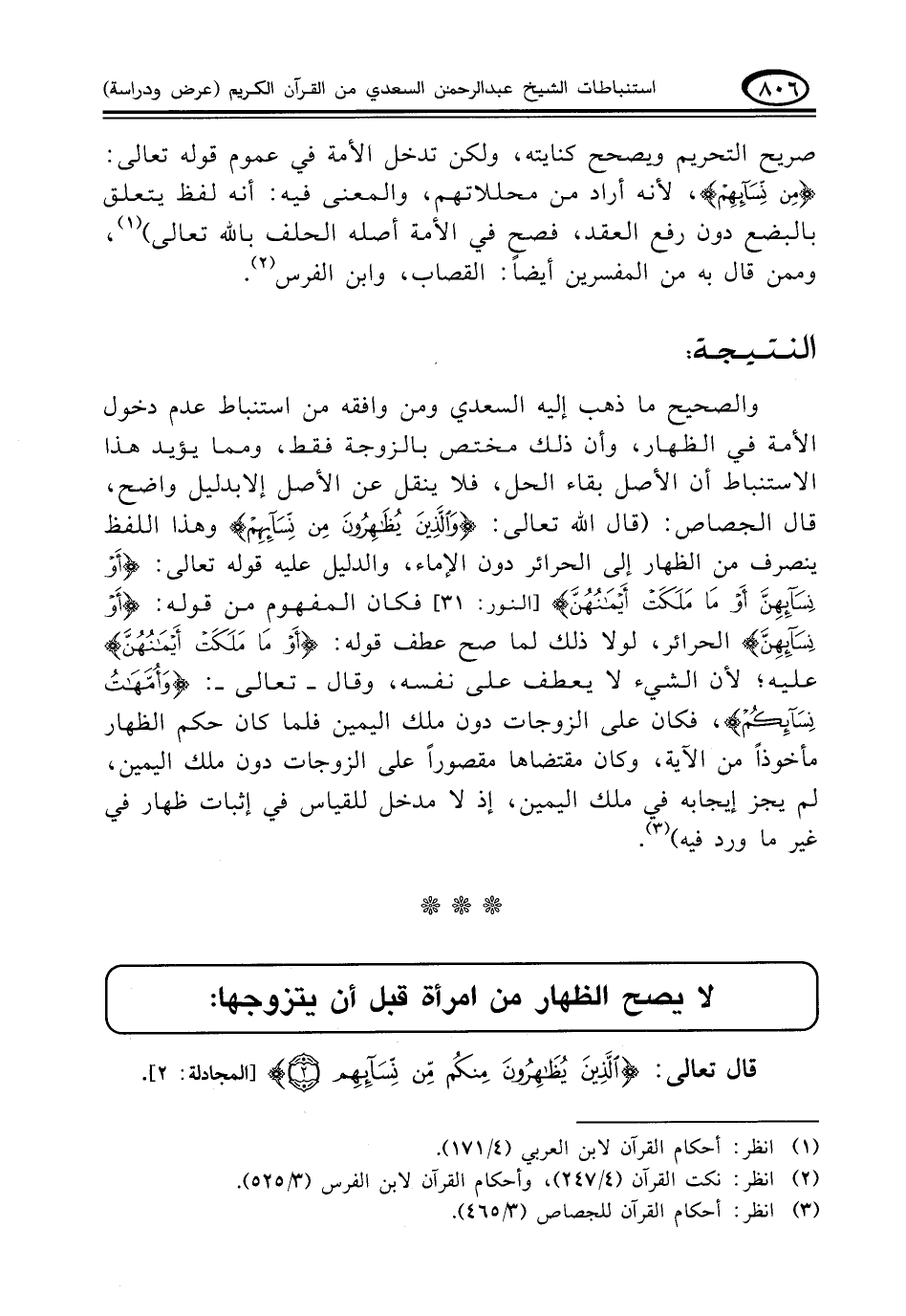 والصحيح ما ذهب إليه السعدي ومن وافقه من استنباط عدم دخول الأمة في الظهار، وأن ذلك مختص بالزوجة فقط، ومما يؤيد هذا الاستنباط أن الأصل بقاء الحل، فلا ينقل عن الأصل إلا بدليل واضح، قال الجصاص: (قال الله تعالى: {وَالَّذِينَ يُظَاهِرُونَ مِنْ نِسَائِهِمْ} وهذا اللفظ ينصرف من الظهار إلى الحرائر دون الإماء، والدليل عليه قوله تعالى: {أَوْ نِسَائِهِنَّ أَوْ مَا مَلَكَتْ أَيْمَانُهُنَّ} (النور: ٣١) فكان المفهوم من قوله: {أَوْ نِسَائِهِنَّ} الحرائر، لولا ذلك لما صح عطف قوله: {أَوْ مَا مَلَكَتْ أَيْمَانُهُنَّ} عليه؛ لأن الشيء لا يعطف على نفسه، وقال - تعالى -: {وَأُمَّهَاتُ نِسَائِكُمْ}، فكان على الزوجات دون ملك اليمين فلما كان حكم الظهار مأخوذاً من الآية، وكان مقتضاها مقصوراً على الزوجات دون ملك اليمين، لم يجز إيجابه في ملك اليمين، إذ لا مدخل للقياس في إثبات ظهار في غير ما ورد فيه) (¬٣).
