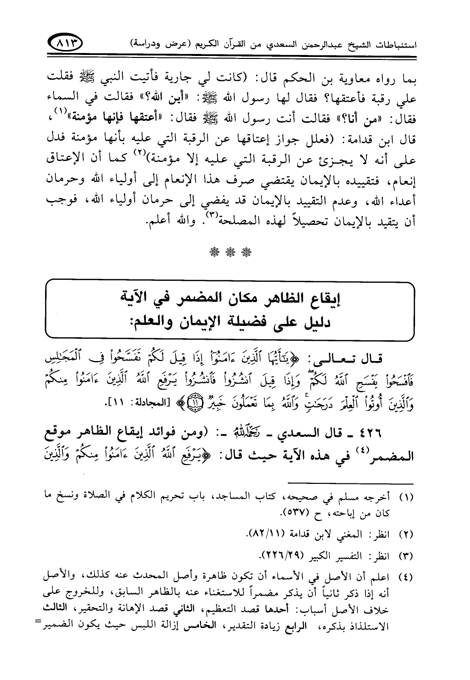 ٤٢٦ - قال السعدي - رحمه الله -: (ومن فوائد إيقاع الظاهر موقع المضمر (¬٤) في هذه الآية حيث قال: {يَرْفَعِ اللَّهُ الَّذِينَ آَمَنُوا مِنْكُمْ وَالَّذِينَ