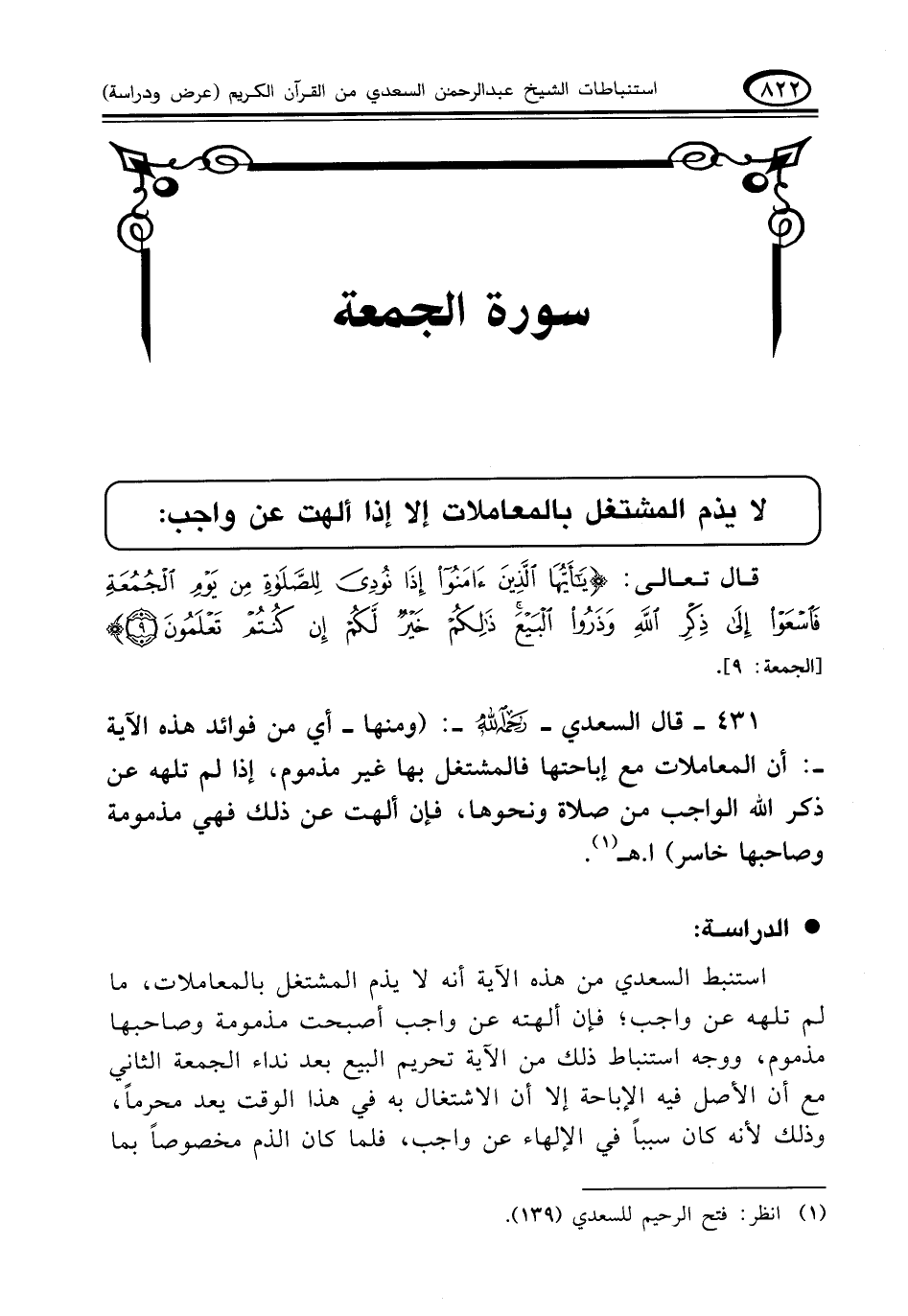 ٤٣١ - قال السعدي - رحمه الله -: (ومنها-أي من فوائد هذه الآية-: أن المعاملات مع إباحتها فالمشتغل بها غير مذموم, إذا لم تلهه عن ذكر الله الواجب من صلاة ونحوها , فإن ألهت عن ذلك فهي مذمومة وصاحبها خاسر). ا. هـ (¬١)