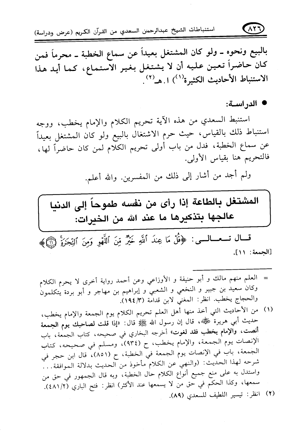 استنبط السعدي من هذه الآية تحريم الكلام والإمام يخطب، ووجه استنباط ذلك بالقياس، حيث حرم الاشتغال بالبيع ولو كان المشتغل بعيداً عن سماع الخطبة، فدل من باب أولى تحريم الكلام لمن كان حاضراً لها، فالتحريم هنا بقياس الأولى.