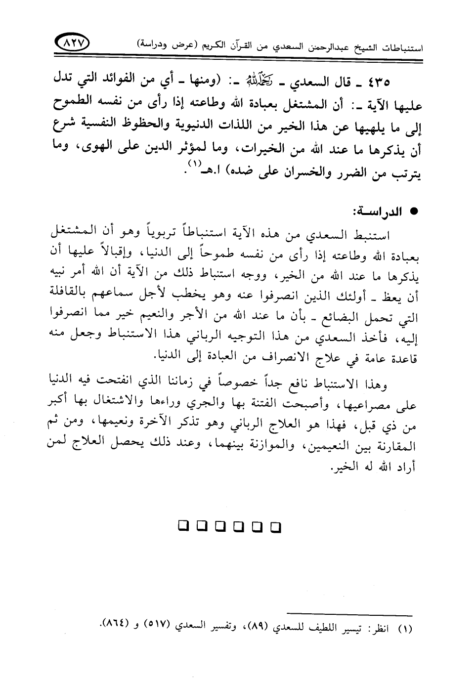 ٤٣٥ - قال السعدي - رحمه الله -: (ومنها - أي من الفوائد التي تدل عليها الآية -: أن المشتغل بعبادة الله وطاعته إذا رأى من نفسه الطموح إلى ما يلهيها عن هذا الخير من اللذات الدنيوية والحظوظ النفسية شرع أن يذكرها ما عند الله من الخيرات، وما لمؤثر الدين على الهوى، وما يترتب من الضرر والخسران على ضده). ا. هـ (¬١)
