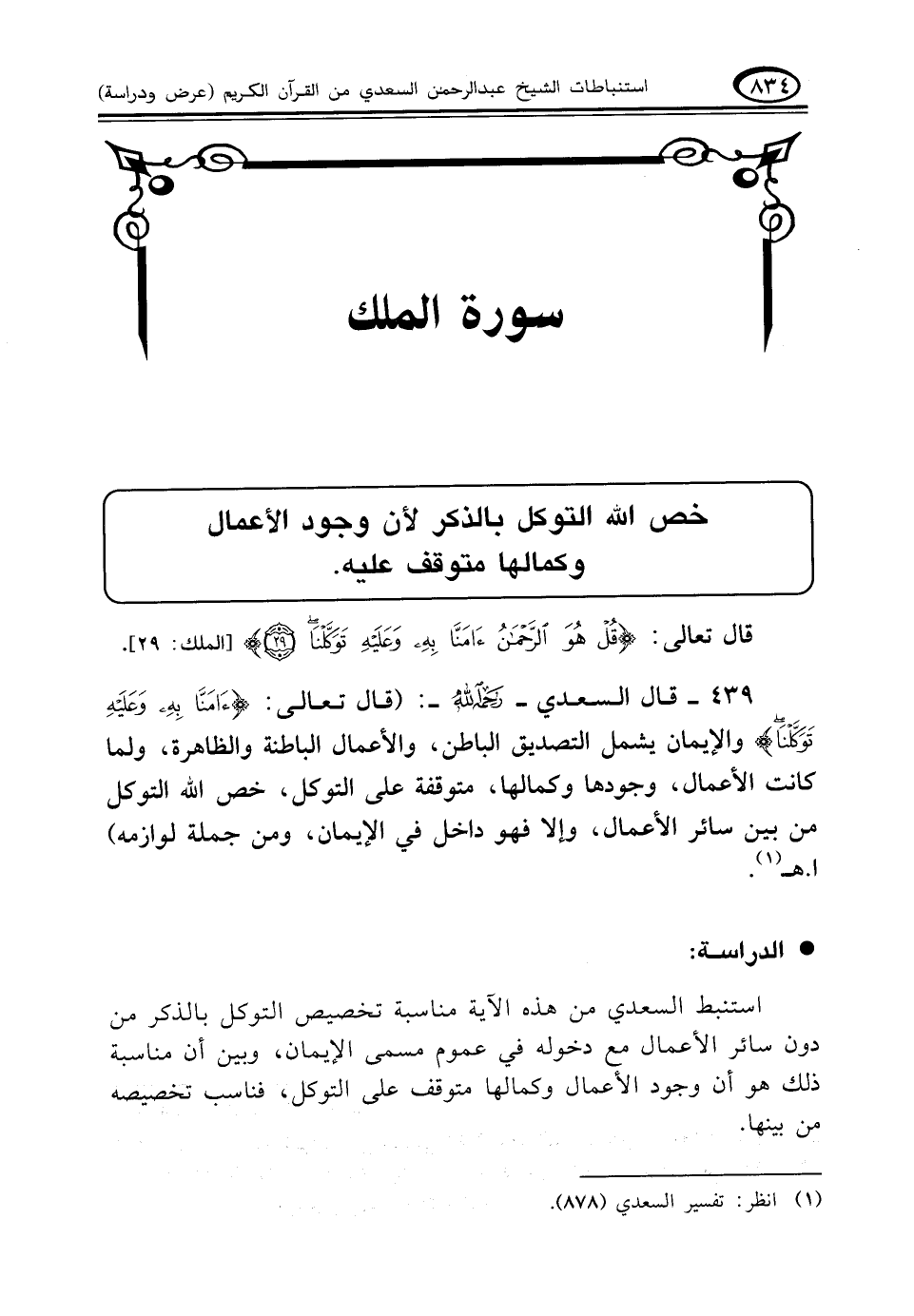 ٤٣٩ - قال السعدي - رحمه الله -: (قال تعالى: {آَمَنَّا بِهِ وَعَلَيْهِ تَوَكَّلْنَا} والإيمان يشمل التصديق الباطن، والأعمال الباطنة والظاهرة، ولما كانت الأعمال، وجودها وكمالها، متوقفة على التوكل، خص الله التوكل من بين سائر الأعمال، وإلا فهو داخل في الإيمان، ومن جملة لوازمه). ا. هـ (¬١)