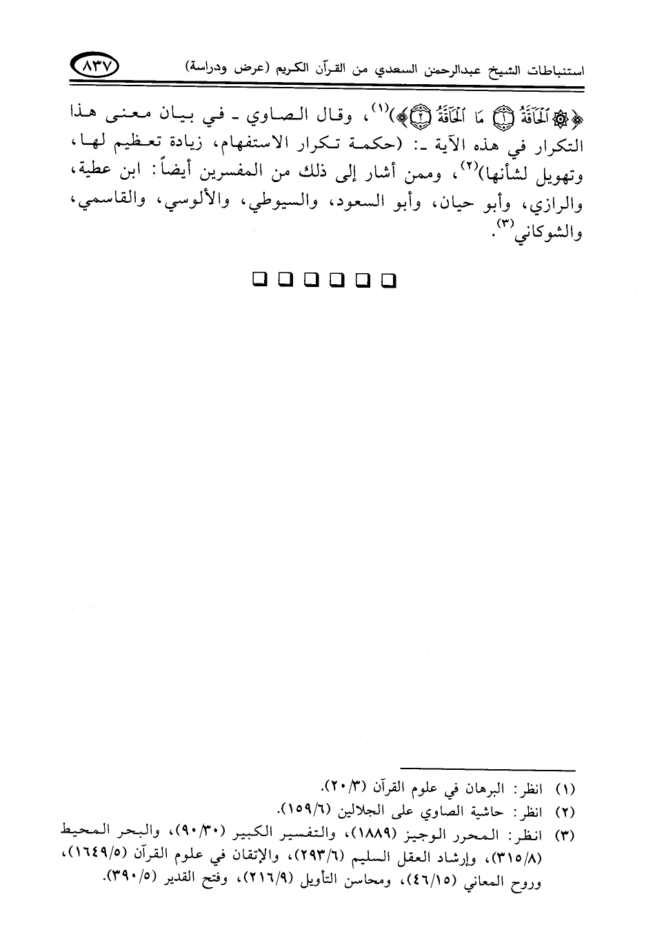 {الْحَاقَّةُ (١) مَا الْحَاقَّةُ (٢)}) (¬١)، وقال الصاوي- في بيان معنى هذا التكرار في هذه الآية-: (حكمة تكرار الاستفهام، زيادة تعظيم لها، وتهويل لشأنها) (¬٢)، وممن أشار إلى ذلك من المفسرين أيضاً: ابن عطية، والرازي، وأبوحيان، وأبو السعود، والسيوطي، والألوسي، والقاسمي، والشوكاني (¬٣).