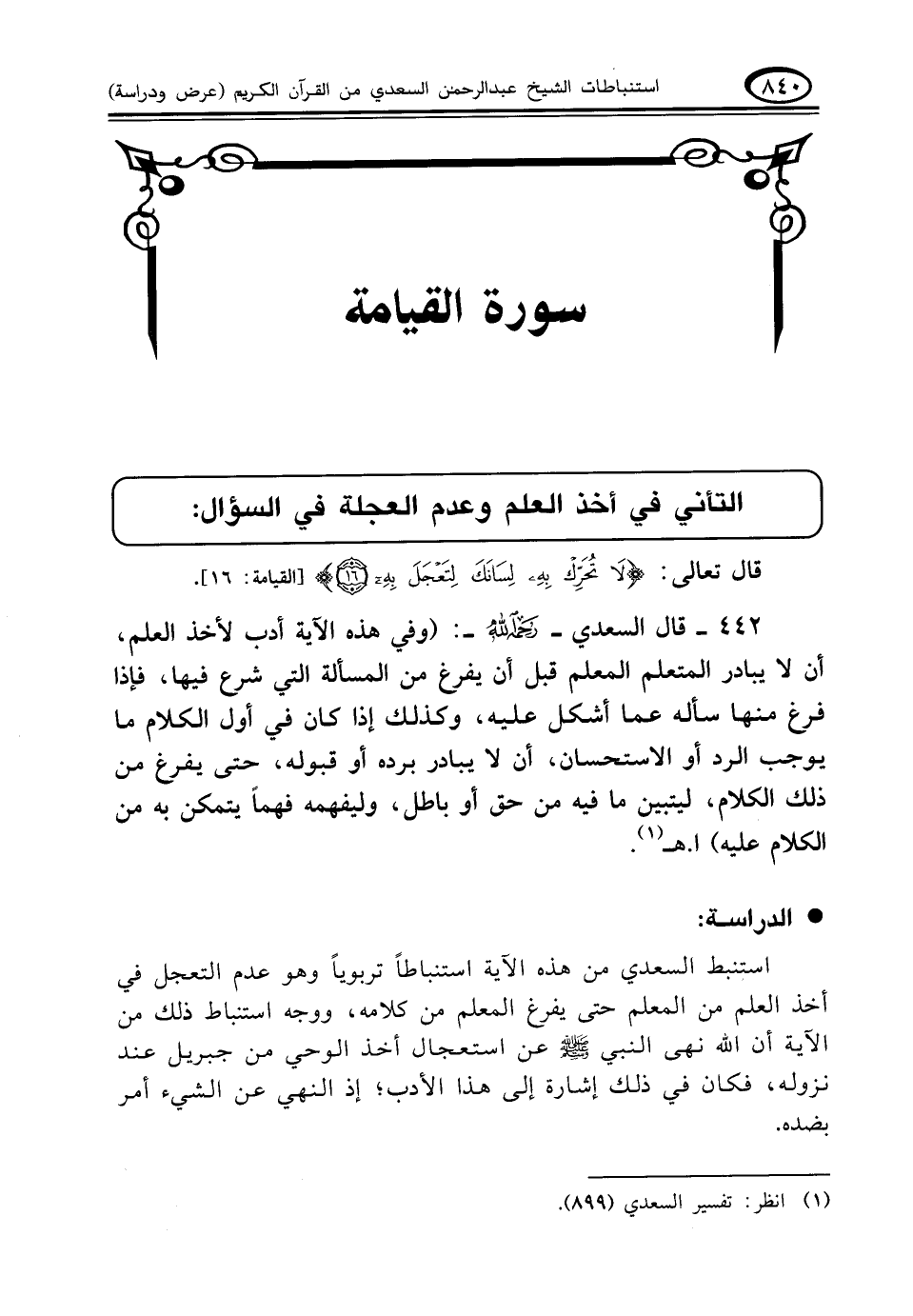 ٤٤٢ - قال السعدي - رحمه الله -: (وفي هذه الآية أدب لأخذ العلم، أن لا يبادر المتعلم المعلم قبل أن يفرغ من المسألة التي شرع فيها، فإذا فرغ منها سأله عما أشكل عليه، وكذلك إذا كان في أول الكلام ما يوجب الرد أو الاستحسان، أن لا يبادر برده أو قبوله، حتى يفرغ من ذلك الكلام، ليتبين ما فيه من حق أو باطل، وليفهمه فهماً يتمكن به من الكلام عليه). ا. هـ (¬١)