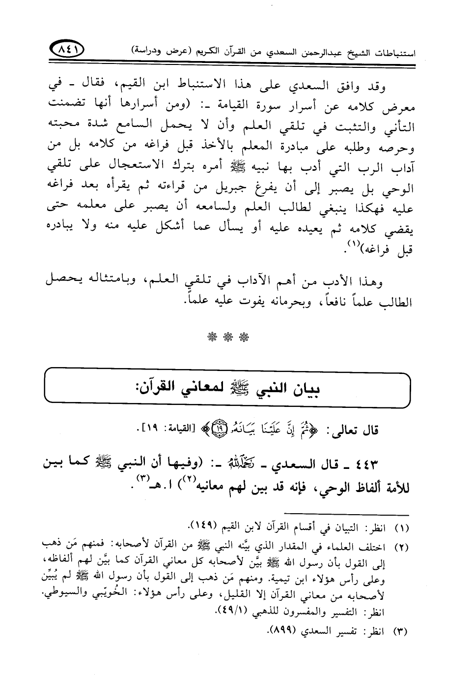 وقد وافق السعدي على هذا الاستنباط ابن القيم، فقال- في معرض كلامه عن أسرار سورة القيامة-: (ومن أسرارها أنها تضمنت التأني والتثبت في تلقي العلم وأن لا يحمل السامع شدة محبته وحرصه وطلبه على مبادرة المعلم بالأخذ قبل فراغه من كلامه بل من آداب الرب التي أدب بها نبيه صلى الله عليه وسلم أمره بترك الاستعجال على تلقي الوحي بل يصبر إلى أن يفرغ جبريل من قراءته ثم يقرأه بعد فراغه عليه فهكذا ينبغي لطالب العلم ولسامعه أن يصبر على معلمه حتى يقضي كلامه ثم يعيده عليه أو يسأل عما أشكل عليه منه ولا يبادره قبل فراغه) (¬١).