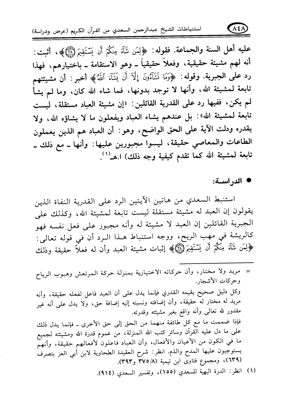 استنبط السعدي من هاتين الآيتين الرد على القدرية النفاة الذين يقولون إن العبد له مشيئة مستقلة ليست تابعة لمشيئة الله، وكذلك على الجبرية القائلين إن العبد لا مشيئة له وأنه مجبور على فعل نفسه فهو كالريشة في مهب الريح، ووجه استنباط هذا الرد أن في قوله تعالى: {لِمَنْ شَاءَ مِنْكُمْ أَنْ يَسْتَقِيمَ} إثبات مشيئة العبد وأن له فعلاً حقيقة وذلك