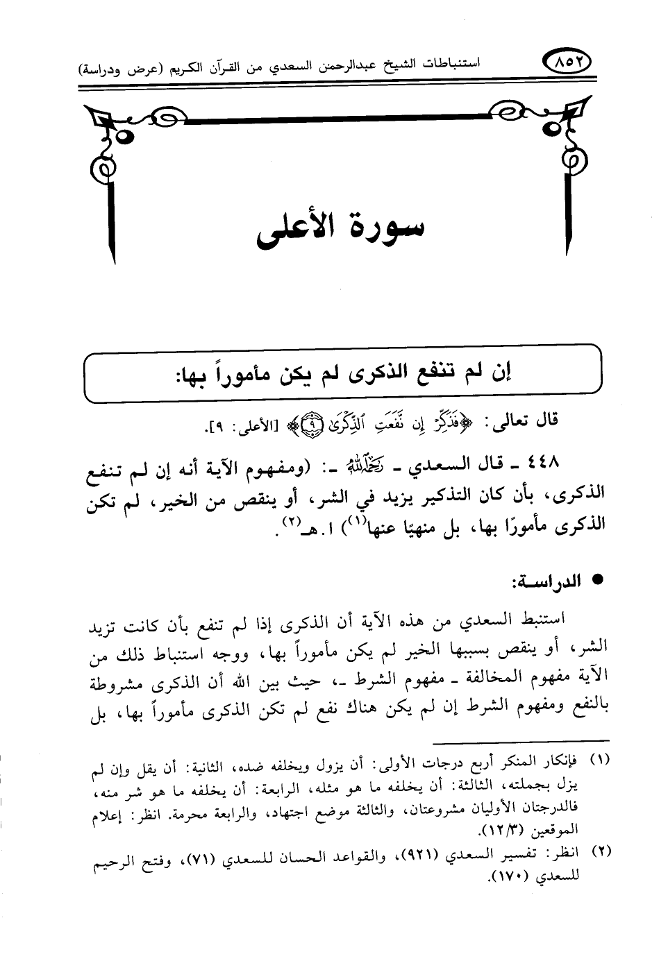 ٤٤٨ - قال السعدي - رحمه الله -: (ومفهوم الآية أنه إن لم تنفع الذكرى، بأن كان التذكير يزيد في الشر، أو ينقص من الخير، لم تكن الذكرى مأمورًا بها، بل منهيًا عنها (¬١)). ا. هـ (¬٢)