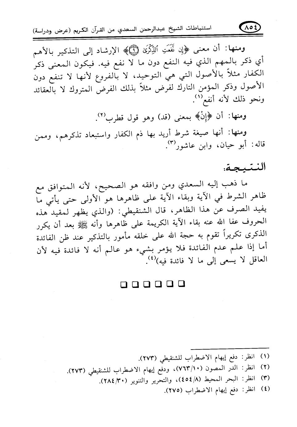 ما ذهب إليه السعدي ومن وافقه هو الصحيح، لأنه المتوافق مع ظاهر الشرط في الآية وبقاء الآية على ظاهرها هو الأولى حتى يأتي ما يفيد الصرف عن هذا الظاهر، قال الشنقيطي: (والذي يظهر لمقيد هذه الحروف عفا الله عنه بقاء الآية الكريمة على ظاهرها وأنه صلى الله عليه وسلم بعد أن يكرر الذكرى تكريراً تقوم به حجة الله على خلقه مأمور بالتذكير عند ظن الفائدة أما إذا علم عدم الفائدة فلا يؤمر بشيء هو عالم أنه لا فائدة فيه لأن العاقل لا يسعى إلى ما لا فائدة فيه) (¬٤).