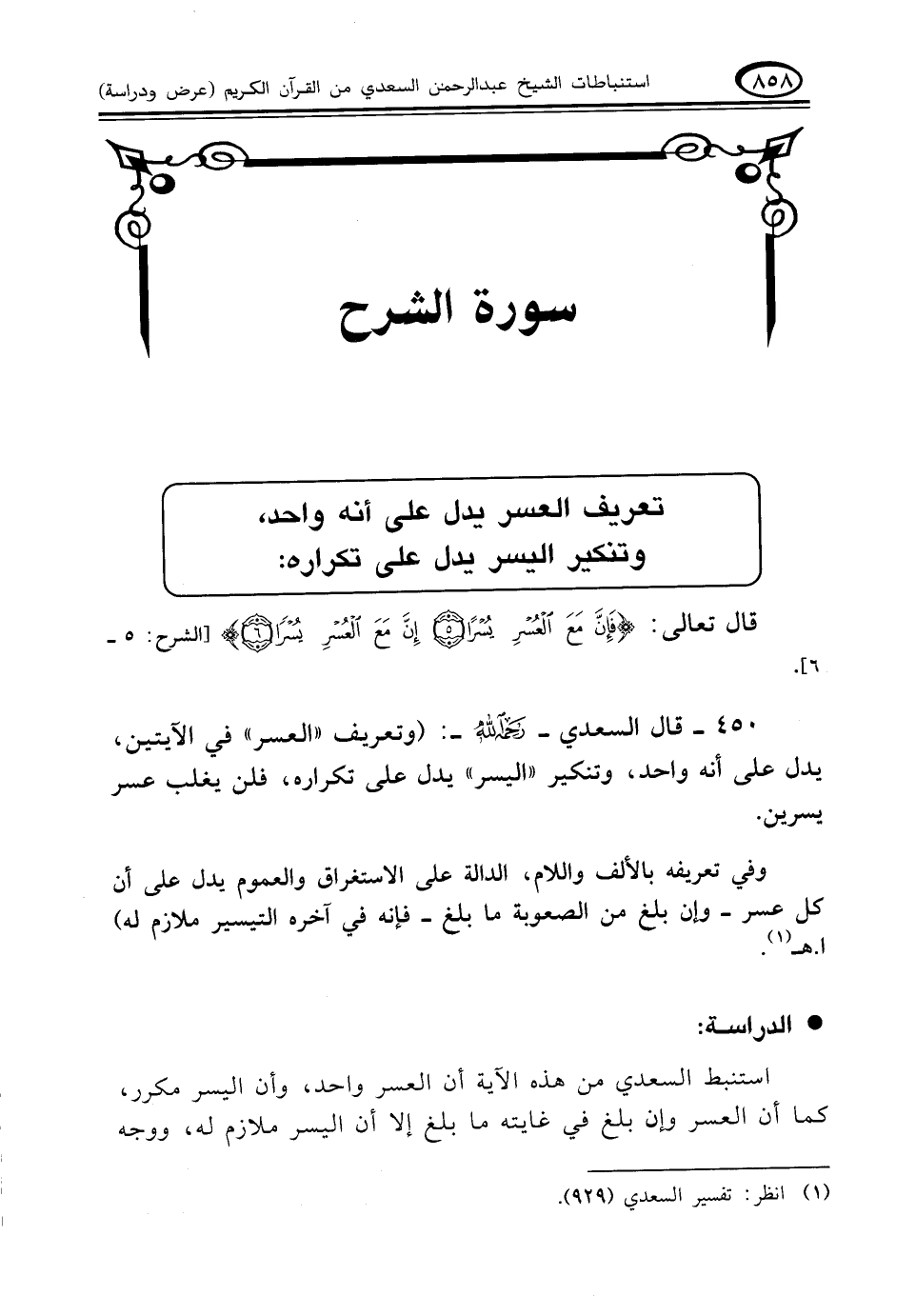 ٤٥٠ - قال السعدي - رحمه الله -: (وتعريف " العسر " في الآيتين، يدل على أنه واحد، وتنكير " اليسر " يدل على تكراره، فلن يغلب عسر يسرين.