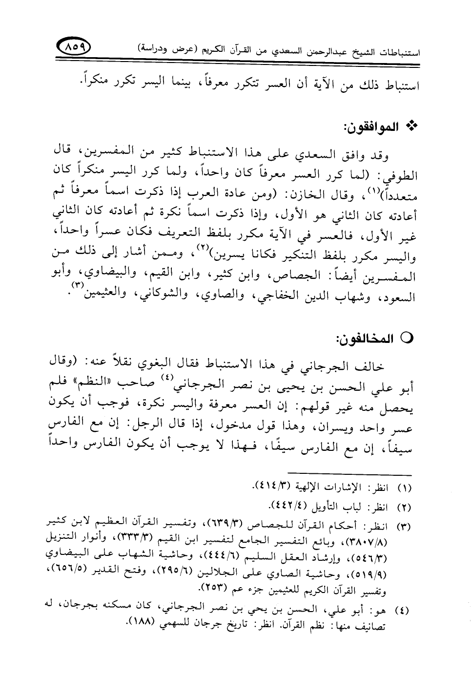 وقد وافق السعدي على هذا الاستنباط كثير من المفسرين، قال الطوفي: (لما كرر العسر معرفاً كان واحداً، ولما كرر اليسر منكراً كان متعدداً) (¬١)، وقال الخازن: (ومن عادة العرب إذا ذكرت اسماً معرفاً ثم أعادته كان الثاني هو الأول، وإذا ذكرت اسماً نكرة ثم أعادته كان الثاني غير الأول، فالعسر في الآية مكرر بلفظ التعريف فكان عسراً واحداً، واليسر مكرر بلفظ التنكير فكانا يسرين) (¬٢)، وممن أشار إلى ذلك من المفسرين أيضاً: الجصاص، وابن كثير، وابن القيم، والبيضاوي، وأبوالسعود، وشهاب الدين الخفاجي، والصاوي، والشوكاني،